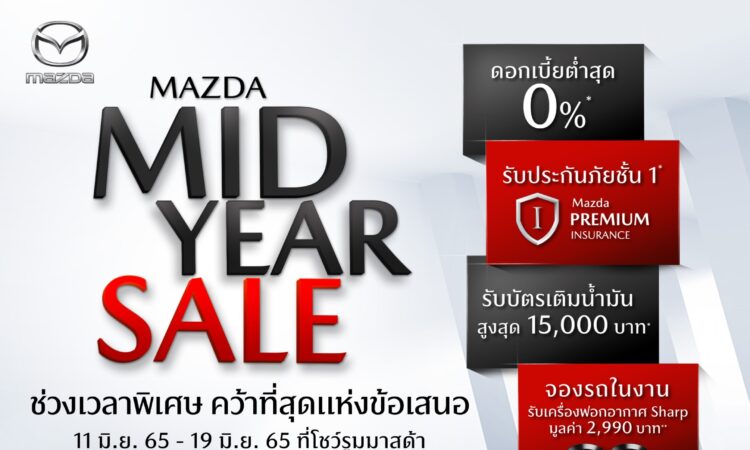 ทั้งนี้ มาสด้าได้เร่งเติมความสุขให้กับลูกค้าในช่วงกลางปี ส่งสองแคมเปญ ทั้ง “MAZDA MID YEAR SALE” ช่วงเวลาพิเศษ คว้าที่สุดแห่งข้อเสนอ ระหว่างวันที่ 11 – 19 มิถุนายน 2565 ให้กับลูกค้าที่ต้องการออกรถใหม่ ดอกเบี้ยต่ำสุด 0%1 ฟรีประกันภัยชั้น 1 Mazda Premium Insurance1 ฟรีบัตรเติมน้ำมันมูลค่าสูงสุด 15,000 บาท และรับฟรีของพรีเมี่ยมสุดพิเศษ