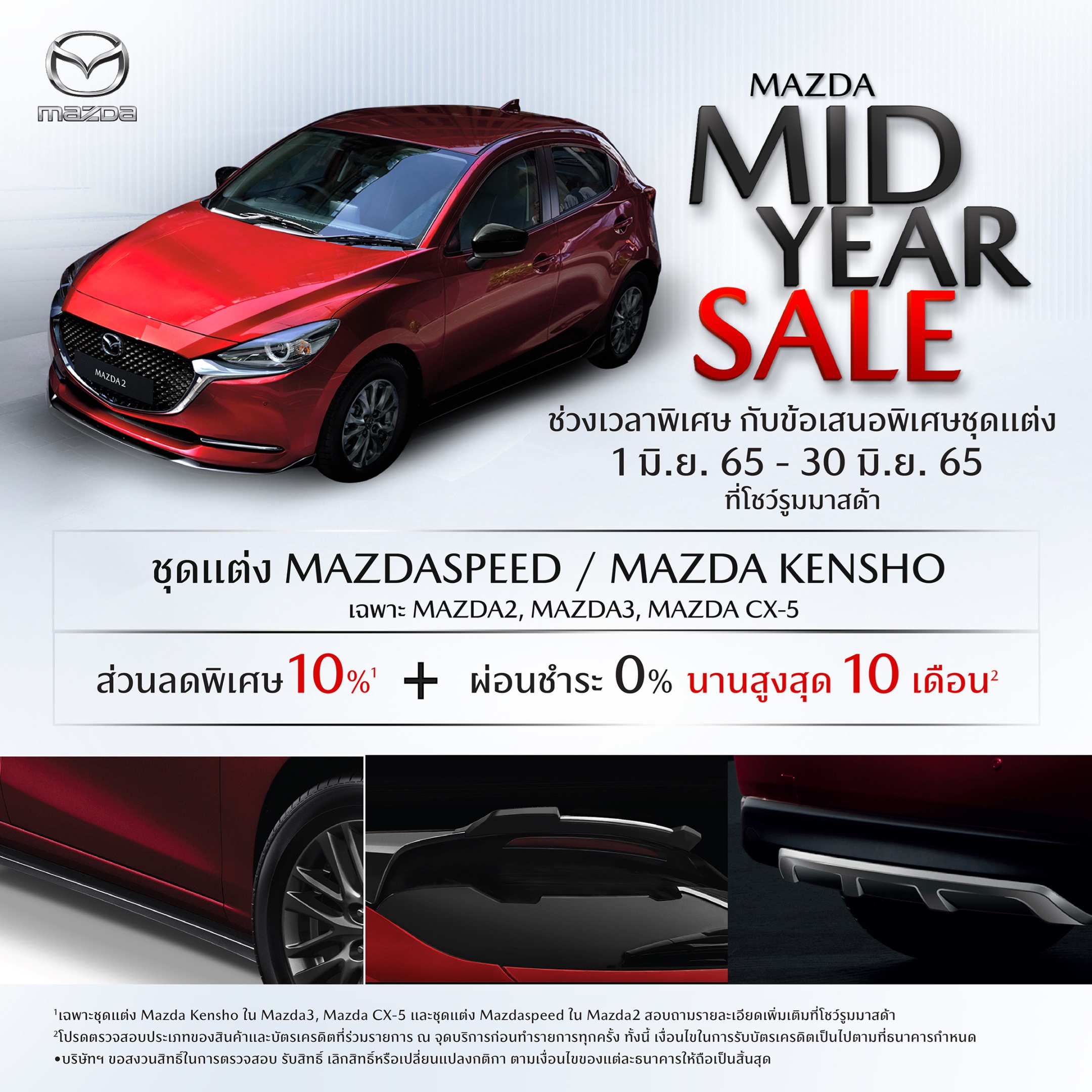 • ลูกค้าปัจจุบันที่ต้องการเสริมหล่อรถยนต์มาสด้า รับข้อเสนอพิเศษชุดแต่ง Mazdaspeed และ Mazda Kensho ในรุ่น Mazda2, Mazda3 และ Mazda CX-5 กับส่วนลดพิเศษ 10% ผ่อนชำระ 0% นานสูงสุด 10 เดือน ระหว่างวันที่ 1– 30 มิ.ย. 65