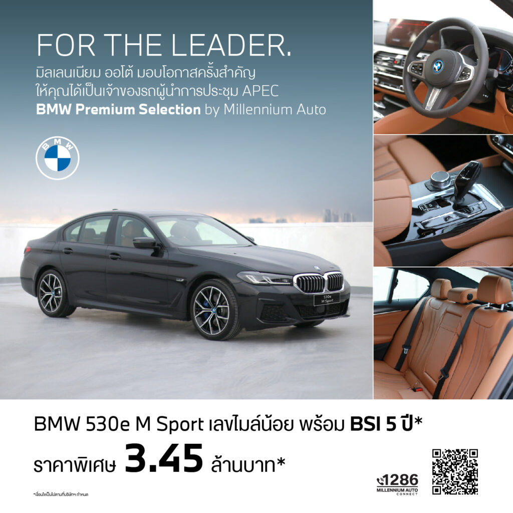 บีเอ็มดับเบิลยู มิลเลนเนียม ออโต้ ผู้จำหน่ายรถยนต์ บีเอ็มดับเบิลยู อย่างเป็นทางการ ยกทัพรถยนต์ป้ายแดง ไมล์น้อย บีเอ็มดับเบิลยู ซีรีส์ 5 ที่ใช้รองรับผู้นำจากนานาประเทศ ในการประชุมสุดยอดผู้นำอาเซียน (APEC) ประจำปี 2565 ที่ไทยเป็นเจ้าภาพ ให้ลูกค้าได้จับจอง