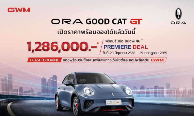 เกรท วอลล์ มอเตอร์ เปิดตัว ORA Good Cat GT ถือเป็นการเปิดตัวในตลาดต่างประเทศนอกประเทศจีนเป็นครั้งแรก พร้อมประกาศราคาที่ 1,549,000 บาท โดยราคาหลังหักส่วนลดและสิทธิประโยชน์จากทางภาครัฐจะอยู่ที่ 1,286,000 บาท เปิดให้จองเป็นเจ้าของ 500 คันแรกในวันที่ 29 มิถุนายน 2565 ตั้งแต่เวลา 20.00 น. จนถึงวันที่ 29 กรกฎาคม 2565 เวลา 23.59 น. เตรียมส่งมอบรถล็อตแรกในเดือนพฤศจิกายนเป็นต้นไป จัดเต็มแคมเปญ ORA Good Cat GT PREMIERE DEAL อัดแน่นด้วยสิทธิประโยชน์มากมาย รวมมูลค่ากว่า 131,000 บาท
