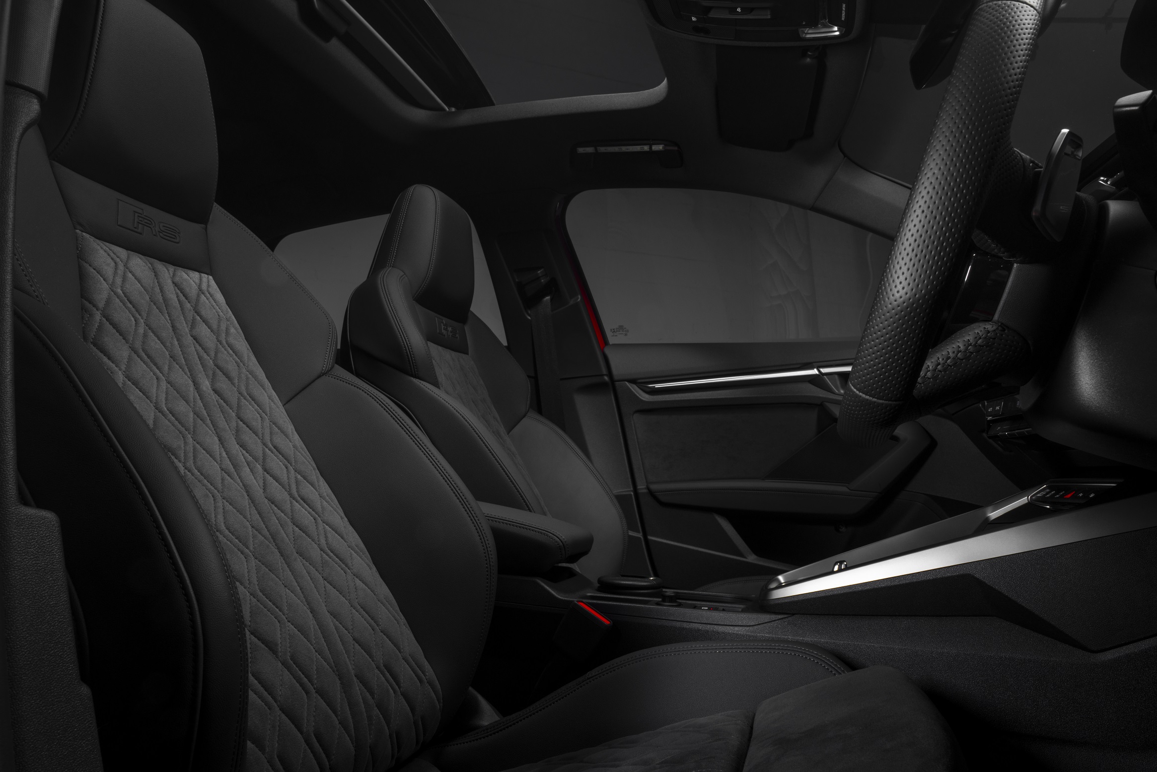 The New Audi RS3 Sportback มาพร้อมกับพวงมาลัยท้ายตัดมัลติฟังชัน สไตล์ RS sport หุ้มหนังพร้อม paddle shift และยังมีปุ่มปรับโหมด RS performance บนพวงมาลัยฝั่งด้านขวา เพื่อให้ง่ายต่อการปรับโหมด โดยไม่ต้องเอามือออกจากพวงมาลัย เบาะหน้าแบบ RS sport stitching ลาย diamond cut