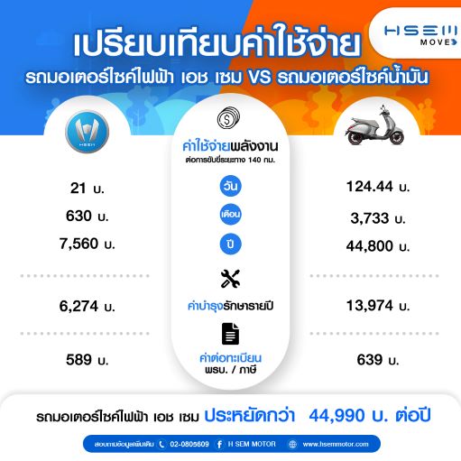เพื่อให้เห็นภาพที่ชัดขึ้น เอช เซม ให้ทีมเปรียบเทียบค่าใช้จ่ายการใช้มอเตอร์ไซค์ไฟฟ้า เอช เซม กับ มอเตอร์ไซค์เครื่องยนต์ทั่วไป ผลออกมาว่า รถมอเตอร์ไซค์ไฟฟ้าเอช เซม ช่วยประหยัดค่าใช้จ่ายได้กว่า 44,990 บาท/ปี (ตามภาพ) ซึ่งหากธุรกิจมีการใช้จำนวนมาก ก็จะคุ้มค่าและประหยัดค่าใช้จ่ายได้มากเช่นกัน
