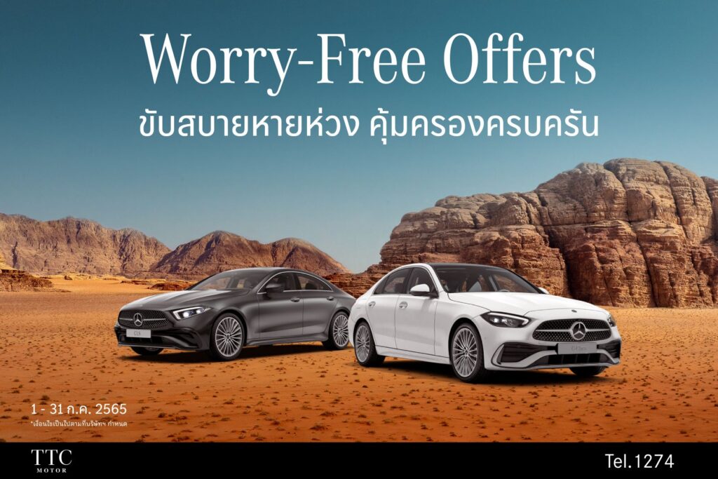 ทีทีซี มอเตอร์ จัดหนัก จัดเต็ม โปรกลางปีกับ “ขับสบาย หายห่วง คุ้มครอง ครบครัน” ให้กับลูกค้า จ่ายเพียงค่างวดเท่านั้น ที่เหลือให้ทีทีซี ดูแลกับ Worry Free Offers ตลอดเดือนกรกฎาคมนี้ ดาวน์ 0% , ผ่อนชำระค่างวดคงที่แน่นอน, รวม Extended MB Protection , รวม MBSP Ultimate Packages และรวมค่าต่อภาษีรถยนต์ เงื่อนไขเป็นไปตามที่บริษัทฯกำหนด รวมทั้งมีรถทดแทนให้กับลูกค้าใช้งานอีกด้วย