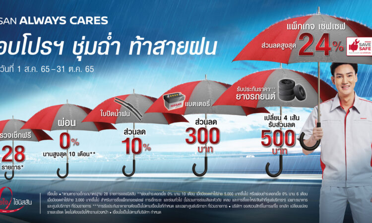 นิสสัน ประเทศไทย ส่งความห่วงใยช่วงหน้าฝน ชวนลูกค้านำรถเข้าเช็กระยะ กับแคมเปญ “NISSAN ALWAYS CARES มอบโปรฯ ชุ่มฉ่ำ ท้าสายฝน” เพิ่มความปลอดภัยและมั่นใจในการขับขี่ ด้วยโปรโมชันและส่วนลดพิเศษมากมาย อาทิ ส่วนลดพร้อมการรับประกันราคายาง และโปรโมชั่นตรวจเช็กระยะฟรี 28 รายการ* ตั้งแต่วันที่ 1 สิงหาคม – 31 ตุลาคม 2565