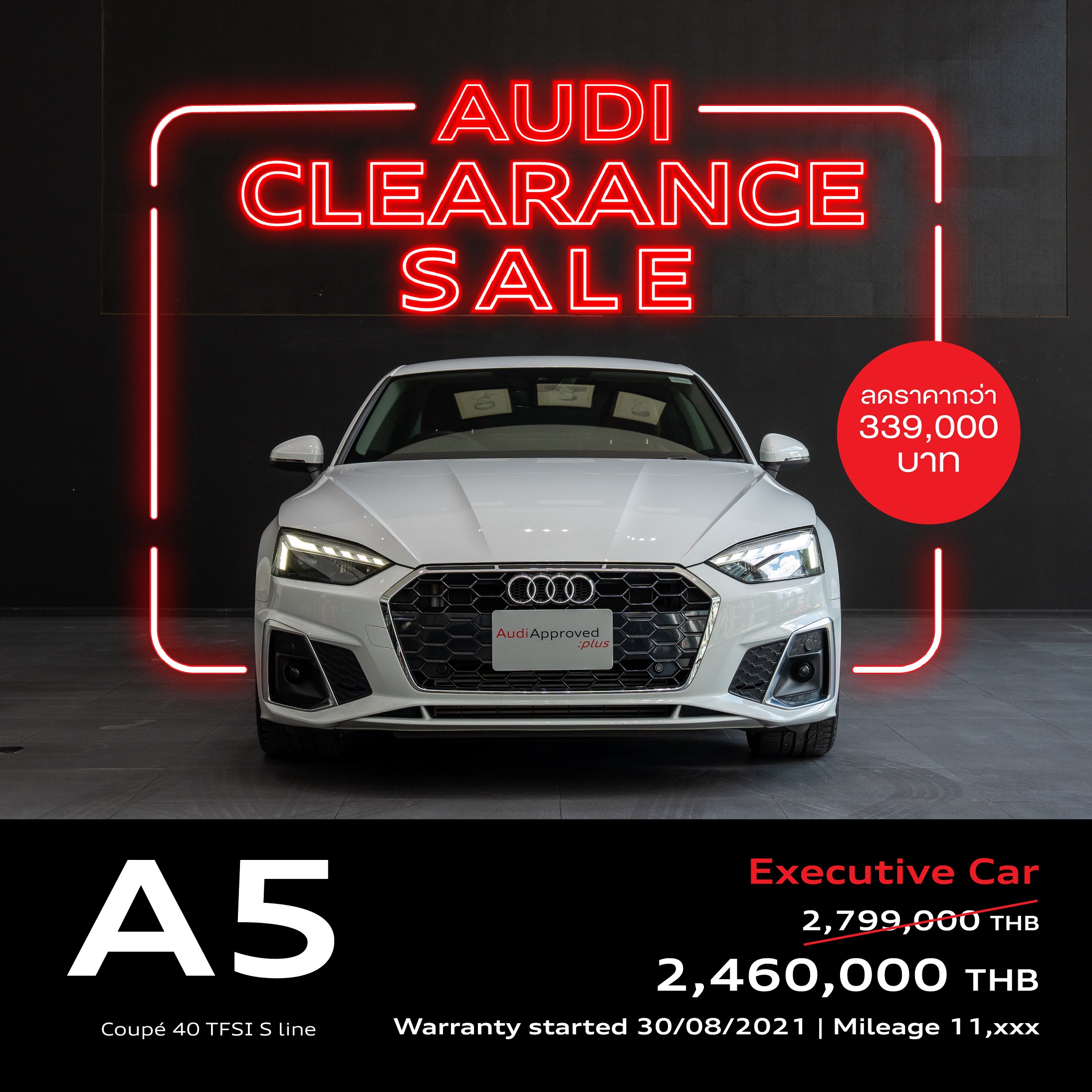 • A5 Coupe 40 TFSI S line (รถทดลองขับ) ราคาพิเศษ 2,460,000 บาท (จากราคารถใหม่ 2,799,000 บาท)