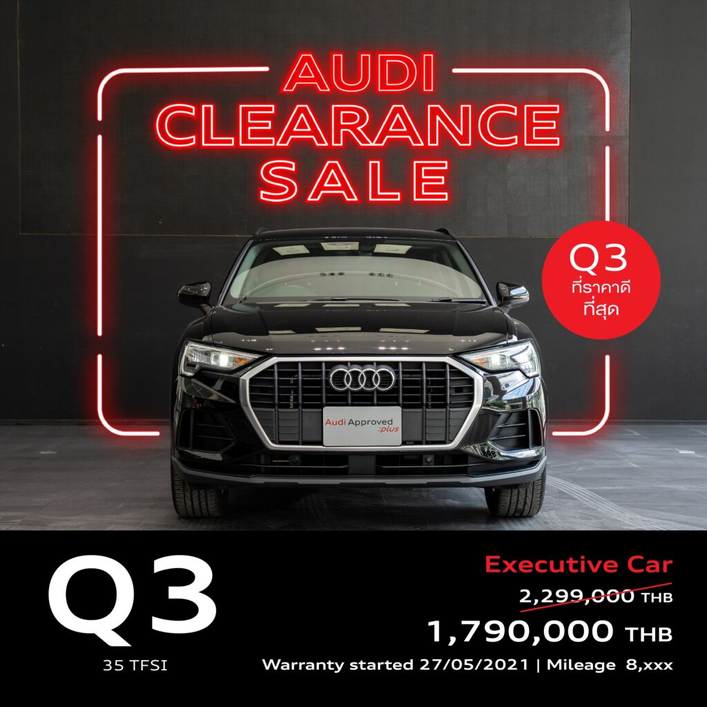 • Q3 35 TFSI (รถผู้บริหาร) ราคาพิเศษ 1,790,000 บาท (จากราคารถใหม่ 2,299,000 บาท) ผ่อนเริ่มต้น 20,500 บาท/เดือน