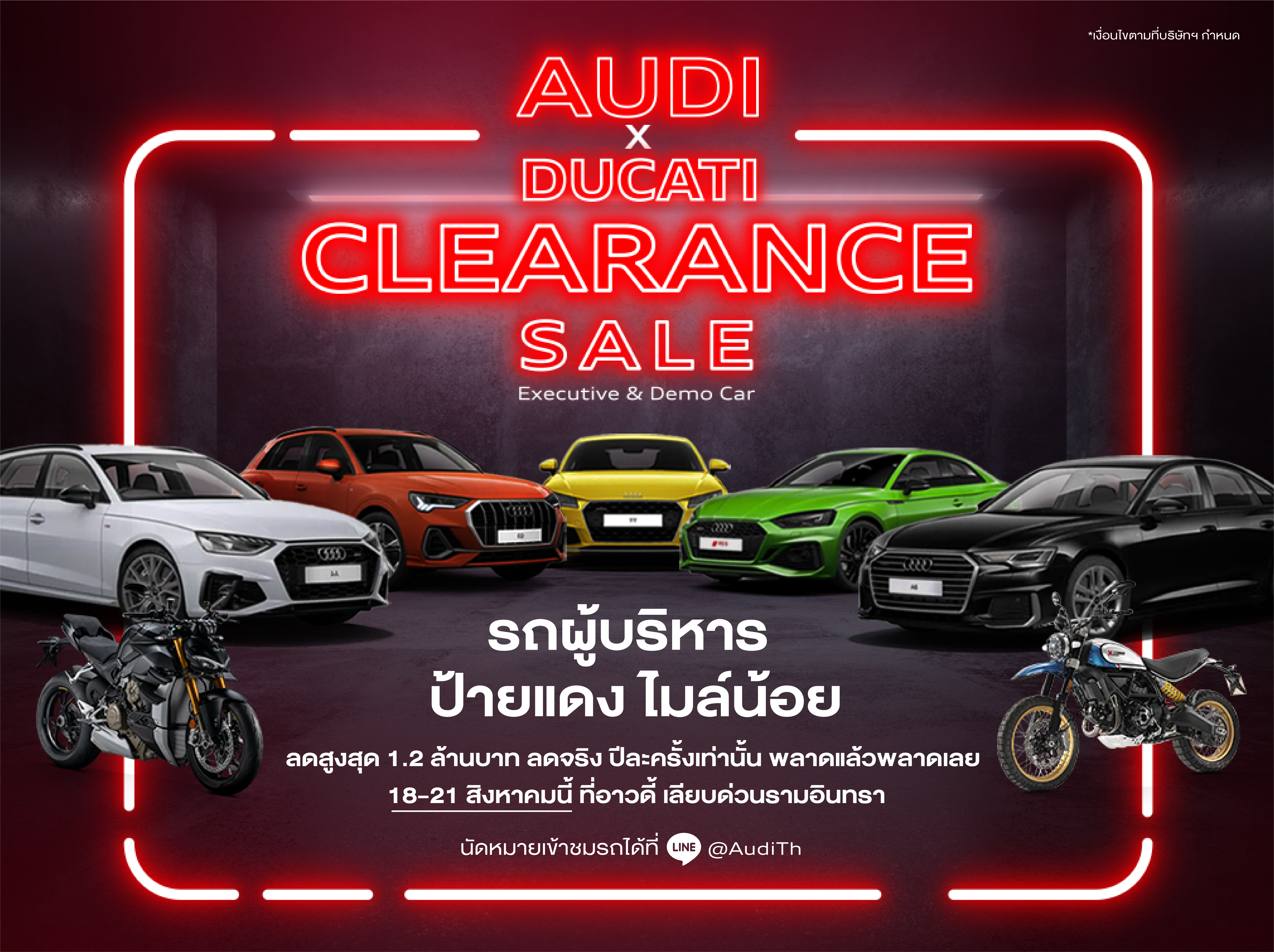ลูกค้าที่สนใจอยากดูรถคันจริงสามารถสอบถามรายละเอียดเพิ่มเติมและนัดหมายล่วงหน้าผ่านบริการ Chat and Shop ได้ ตามช่องทาง Facebook (Audi Bangkok / Ducati Thailand) และ Line official (@Audith และ @ducatithailand) เฉพาะวันที่ 18-21 สิงหาคมนี้ ที่โชว์รูมอาวดี้และดูคาติ สาขาเลียบทางด่วนเอกมัย-รามอินทรา โดยขยายเวลาเปิดบริการ เวลา 08.00-20.00 น. 4 วัน เท่านั้น
