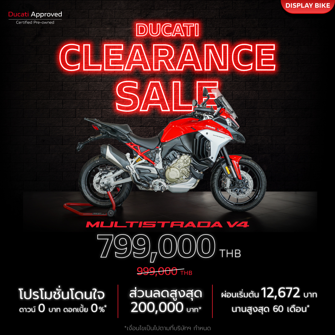 “สำหรับ Ducati เป็นครั้งแรกกับงาน Clearance Sale เราขนขบวนรถทดลองขับ และรถ Display พร้อมข้อเสนอแบบจัดเต็ม บางคันมีสภาพเหมือนใหม่ ไมล์น้อยเพียงร้อยกว่ากิโลเมตร จัดมาให้เหล่าไบค์เกอร์ในราคาพิเศษ ส่วนลดสูงสุดกว่า 379,000 บาท (Multistrada V4S) พร้อมแคมเปญเดียวกับรถใหม่ ดาวน์ 0 บาท และดอกเบี้ย 0% ทุกคัน ราคารถในงานเริ่มต้นเพียง 296,650 บาท เลือกผ่อนสบายเพียง 4,999 บาท/เดือน ก็เป็นเจ้าของ Scrambler Icon Dark ได้”