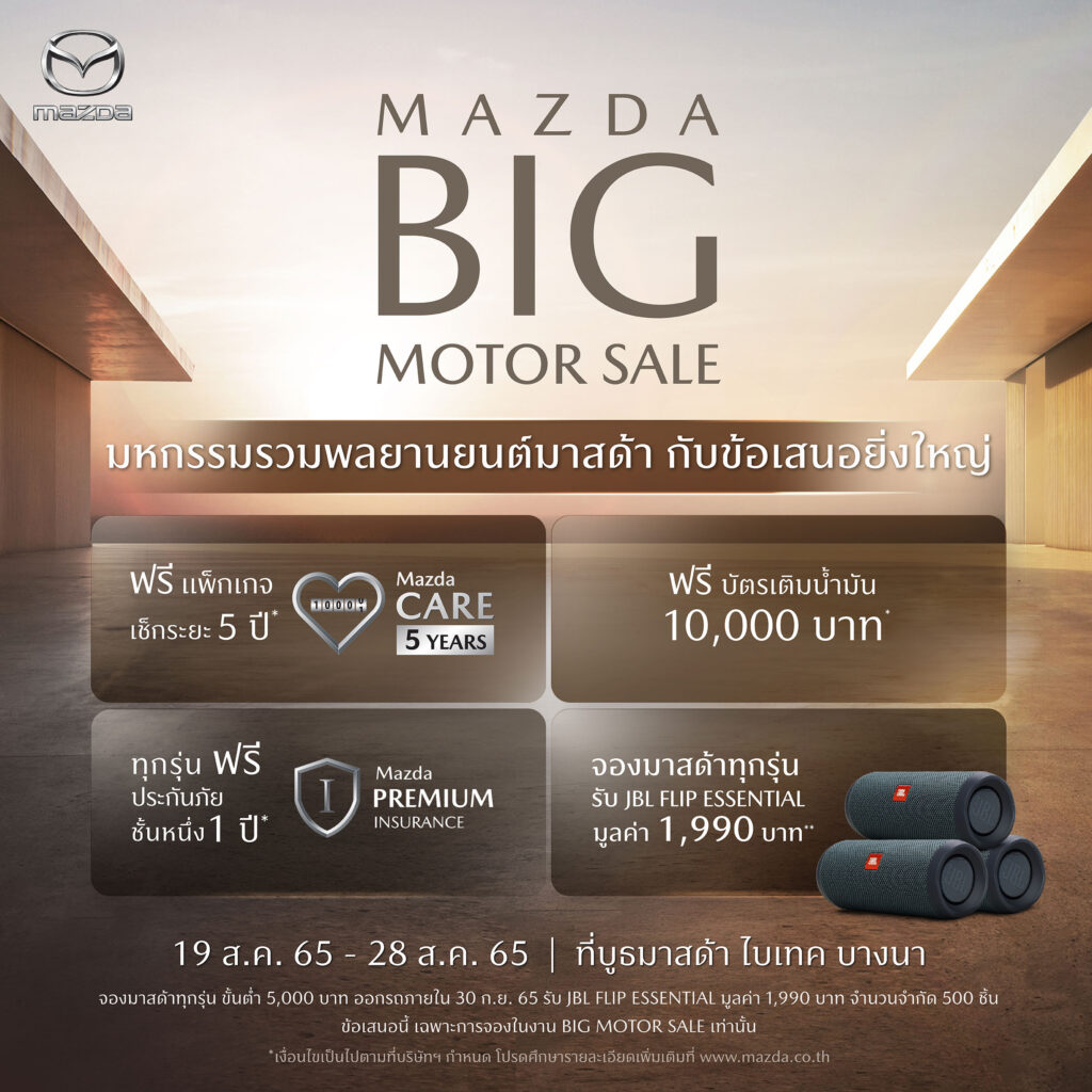 มาสด้า เซลส์ ประเทศไทย จัดหนักงาน Big Motor Sale 2022 ยกทัพยนตรกรรมภายใต้เทคโนโลยีสกายแอคทีฟมาจัดแสดงแน่นบูธ นำโดย New Mazda CX-8 ครอสโอเวอร์อเนกประสงค์ระดับพรีเมี่ยมแบบ 3 แถว รุ่นใหม่ล่าสุดที่เพิ่งเปิดตัว มาพร้อมดีไซน์ใหม่สุดหรูและเทคโนโลยีใหม่เต็มคัน ตอบโจทย์ความต้องการของครอบครัวรุ่นใหม่ได้อย่างลงตัว พร้อมมอบข้อเสนอร้อนแรงเกินห้ามใจให้เป็นเจ้าของยนตรกรรมมาสด้าทุกรุ่นได้อย่างคุ้มค่า อาทิ ฟรีแพ็กเกจบำรุงรักษารถ Mazda Care 5 ปี ฟรีบัตรเติมน้ำมัน 10,000 บาท ฟรีประกันภัยชั้นหนึ่ง Mazda Premium Insurance 1 ปี และฟรีลำโพงบลูทูธ JBL Flip Essential มูลค่า 1,990 บาท สำหรับลูกค้า 500 ท่านแรก ที่จองรถภายในงานตั้งแต่ 5,000 บาท และออกรถภายใน 30 กันยายน 2565 ผู้ที่สนใจสามารถรับข้อเสนอได้ที่งาน Big Motor Sale 2022 ณ ศูนย์นิทรรศการและการประชุมไบเทค บางนา ระหว่างวันที่ 19-28 สิงหาคม 2565 และรับข้อเสนอเดียวกันนี้ที่โชว์รูมมาสด้าทั่วประเทศ