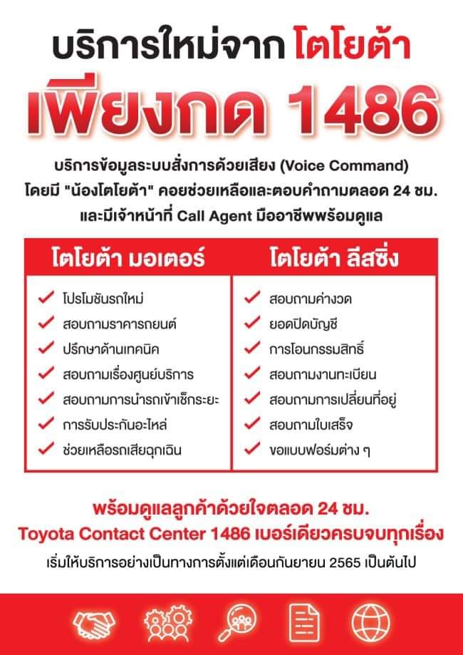 โตโยต้า มอเตอร์ ประเทศไทย ร่วมกับ บริษัท โตโยต้า ลีสซิ่ง (ประเทศไทย) จำกัด นำเสนอบริการใหม่เพื่อเพิ่มความสะดวกในการใช้บริการให้กับลูกค้า ด้วยการรวมศูนย์บริการข้อมูลลูกค้า ผ่านหมายเลขโทรศัพท์ 1486 ตลอด 24 ชม.