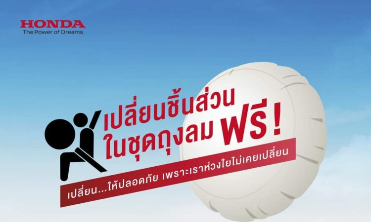 เพราะความปลอดภัยเป็นหนึ่งในเป้าหมายหลักการดำเนินธุรกิจของฮอนด้าในปีพ.ศ. 2593 เพื่อมุ่งสร้างสังคมปลอดอุบัติเหตุและลดการเสียชีวิตที่เกี่ยวข้องกับรถยนต์และรถจักรยานยนต์ฮอนด้าทั่วโลกให้เป็นศูนย์ (Zero Traffic Collision Fatalities) บริษัท ฮอนด้า ออโตโมบิล (ประเทศไทย) ให้ความสำคัญกับคุณภาพของผลิตภัณฑ์และความปลอดภัยของลูกค้าด้วยความห่วงใยเสมอมา เช่นเดียวกับกรณีการเปลี่ยนชิ้นส่วนในชุดถุงลม เพื่อแสดงความรับผิดชอบต่อคุณภาพผลิตภัณฑ์ และเสริมความมั่นใจและความปลอดภัยในการขับขี่บนท้องถนน เดินหน้าแคมเปญ “เปลี่ยน…ให้ปลอดภัย เพราะเราห่วงใยไม่เคยเปลี่ยน” แจ้งลูกค้าฮอนด้าที่มีรถยนต์อยู่ในข่ายต้องเปลี่ยนชิ้นส่วนในชุดถุงลมที่ยังไม่ได้เข้ารับบริการ สามารถนำรถยนต์เข้ารับบริการได้ที่ศูนย์บริการฮอนด้าทั่วประเทศ 228 แห่ง ได้โดยไม่มีค่าใช้จ่ายใด ๆ ทั้งสิ้น