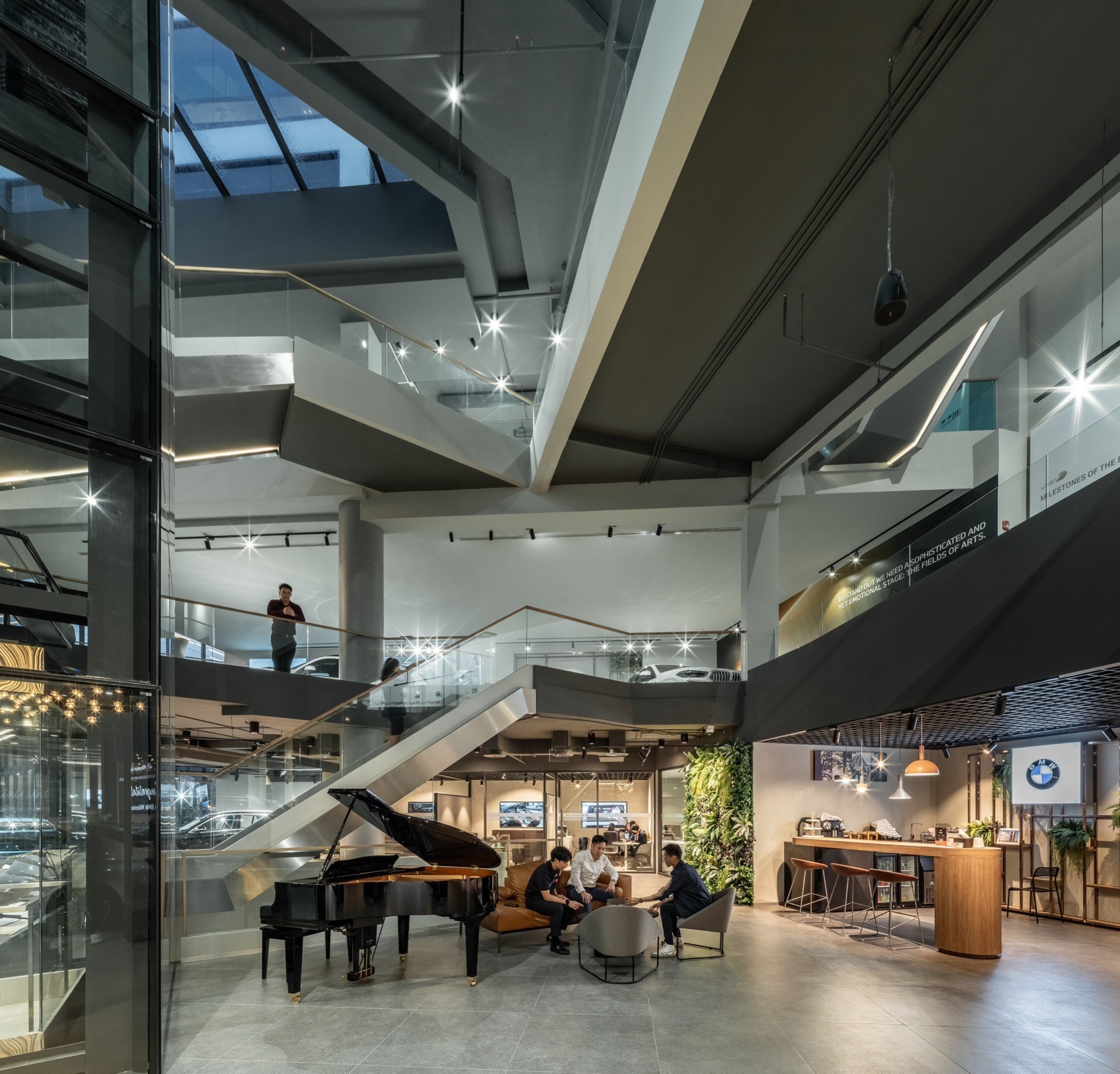 ที่หลากหลาย ให้ความรู้สึกผ่อนคลายเหมือนอยู่ในแกลเลอรี่ ทอดสายตาขึ้นไปด้านบน ก็พบกับชั้นลอยเป็นที่ตั้งของยนตรกรรมระดับหรูของ บีเอ็มดับเบิลยู อาทิ บีเอ็มดับเบิลยูซีรีส์ 7 และ X7 โดยในแต่ละโซน ติดตั้งจอแอลอีดีขนาดใหญ่ ฉายภาพแสดงเรื่องราวและข้อมูลของรถยนต์รุ่นนั้นๆ เสริมประสบการณ์ในการชมรถยนต์คันโปรดได้เป็นอย่างดี