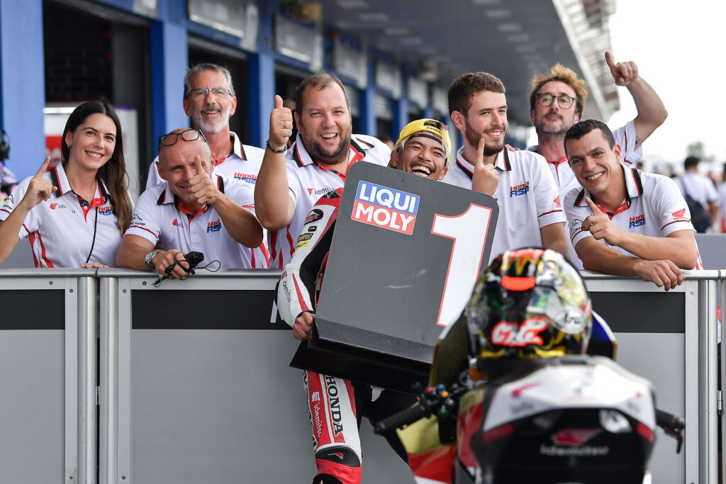 ผลควอลิฟายในรุ่นโมโตทู ปรากฏว่า “ก้อง” สมเกียรติ ทำผลงานระดับมาสเตอร์ผงาดคว้าโพลโพซิชั่นไปครองได้อย่างยิ่งใหญ่ด้วยเวลาต่อรอบ 1 นาที 35.625 วินาที สร้างประวัติศาสตร์เป็นนักแข่งไทยคนแรกที่คว้าโพลในระดับเวิลด์กรังด์ปรีซ์ เฉือน โทนี อาร์โบลิโน นักบิดอิตาเลียนจาก มาร์ค วีดีเอส เรซซิ่ง กริดที่ 2 เพียง 0.085 วินาทีเท่านั้น ส่วนกริดที่ 3 เป็นของ ไอ โอกูระ ทีมเมทชาวญี่ปุ่นตามหลัง 0.264 วินาที ด้าน เขมินท์ ฟอร์มดีผ่านเข้าสู่ Q2 ได้เป็นครั้งแรก ก่อนคว้ากริดที่ 16 ตามหลังหัวแถว 1.735 วินาที