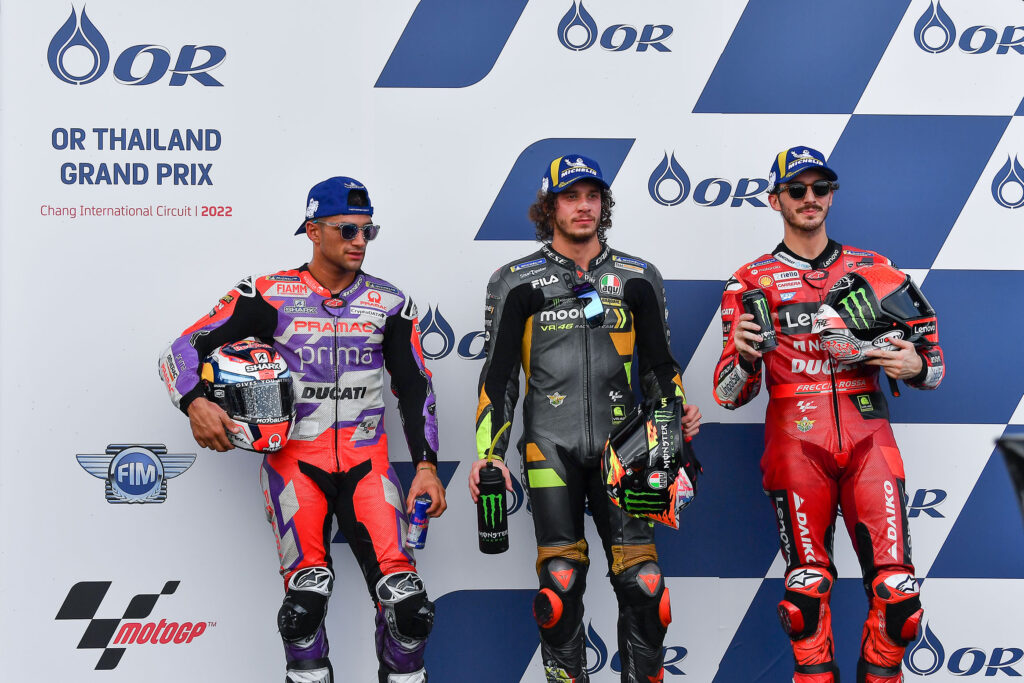ส่วนผลควอลิฟายในรุ่นใหญ่ที่สุดของโลก “โมโตจีพี” มาร์โก เบซเซ็คคี นักบิดรุกกี้ชาวอิตาเลียนจาก มูนนีย์ วีอาร์46 เรซซิ่ง ทีม ผงาดคว้าโพลไปครอง พร้อมสร้างสถิติใหม่ให้กับ สนามช้าง อินเตอร์เนชั่นแนล เซอร์กิต จ.บุรีรัมย์ ด้วยเวลาต่อรอบ 1 นาที 29.671 วินาที เฉือน ฮอร์เก มาร์ติน นักบิดสแปนิชจาก พรีมา พรามัค เรซซิ่ง อันดับ 2 เพียง 0.021 วินาที ขณะที่ ฟรานเชสโก บันยาญ่า รองจ่าฝูงชาวอิตาเลียนจาก ดูคาติ เลโนโว ทีม รั้งกริดที่ 3 ตามหลัง 0.104 วินาที