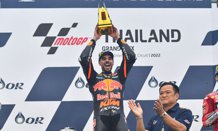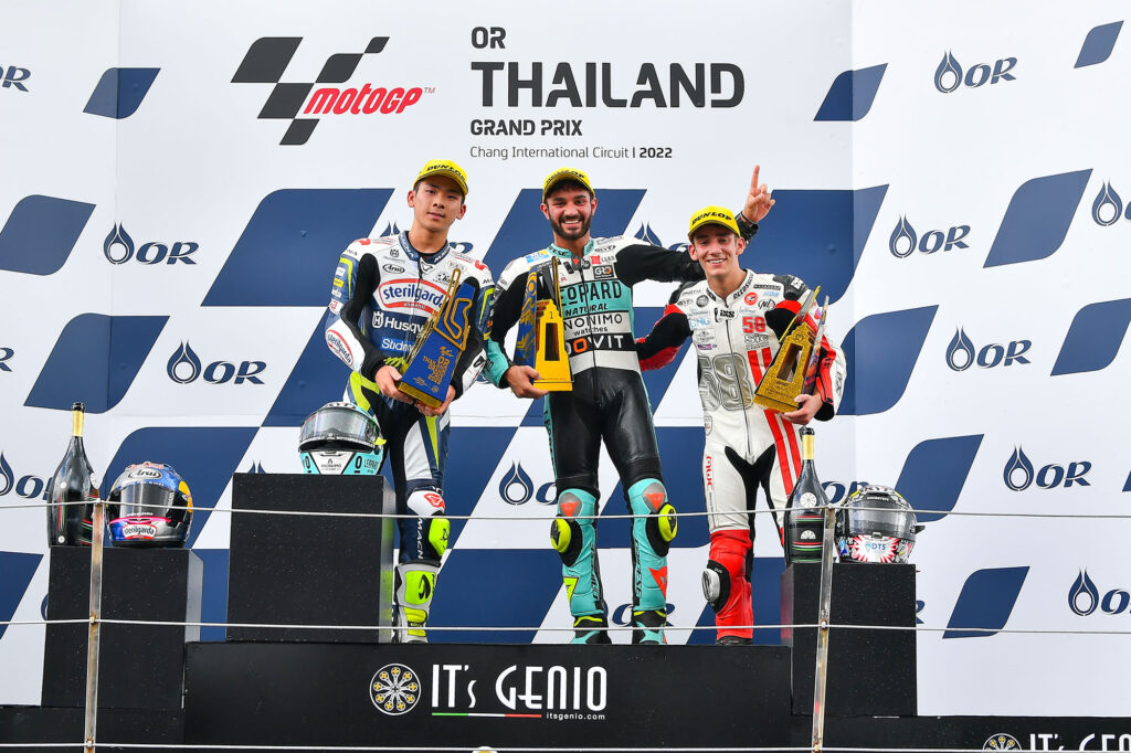 ศึกจักรยานยนต์ทางเรียบรายการใหญ่ที่สุดของโลก โมโตจีพี 2022 สนาม 17 รายการ โออาร์ ไทยแลนด์ กรังด์ปรีซ์ ปิดฉากลงอย่างยิ่งใหญ่ประทับใจแฟนๆ ทั่วโลก ผู้ชมทะลักสู่สนามถึง 178,463 คน อัดแน่นทุกสแตนด์ ภายใต้การลุ้นแชมป์สุดเข้มข้น เกมรุ่นใหญ่ “มิเกล โอลิเวียร่า” นักบิดโปรตุกีสจาก เรดบูล เคทีเอ็ม แฟ็คตอรี หักปากกาเซียนฝ่าฝนผงาดเป็นผู้ชนะคนใหม่ ส่วน“ก้อง” สมเกียรติ จันทรา นักบิดไทยจาก อิเดมิตสึ ฮอนด้า ทีม เอเชีย ขึ้นนำก่อนพลาดล้มดับฝันแฟนชาวไทย ขณะ “เคเคซัง” เขมินท์ คูโบะ จาก ยามาฮ่า วีอาร์46 มาสเตอร์ แคมป์ ระเบิดฟอร์มคว้าท็อป 9 ในรุ่น โมโตทู