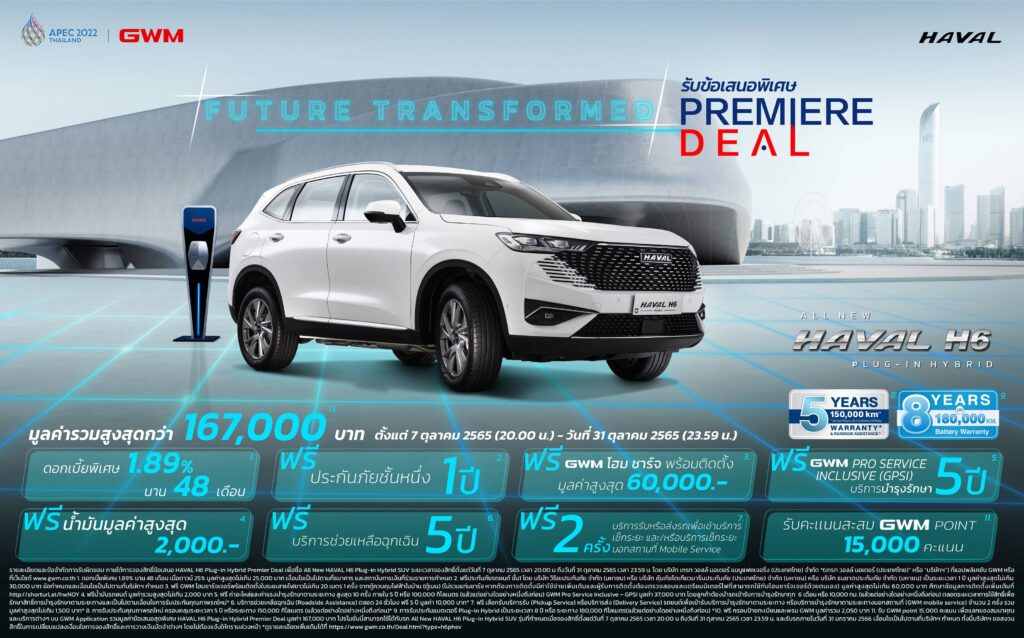 เกรท วอลล์ มอเตอร์ เปิดตัว All New HAVAL H6 Plug-in Hybrid SUV ในประเทศไทยอย่างเป็นทางการ ชูแนวคิด “Future Transformed” ที่ผสานดีไซน์ ขุมพลัง และเทคโนโลยีล้ำสมัยแห่งอนาคตไว้ในหนึ่งเดียว สะท้อนมิติใหม่ที่เหนือชั้นของรถยนต์ Plug-in Hybrid โดยประกาศราคาจำหน่ายที่ 1,699,000 บาท ยกกำลังความร้อนแรงกับแคมเปญ PREMIERE DEAL สุดพิเศษที่มาพร้อมกับสิทธิ์ประโยชน์เร้าใจมากมายสำหรับแฟนพันธุ์แท้รวมมูลค่ากว่า 167,000 บาท สำหรับผู้ที่จองรถตั้งแต่วันที่ 7 ตุลาคม พ.ศ. 2565 เวลา 20:00 น. จนถึงวันที่ 31 ตุลาคม 2565 พร้อมเปิดโอกาสให้ผู้ที่สนใจสามารถติดต่อขอลงทะเบียนทดลองขับได้ที่ GWM Partner Store ทั่วประเทศ ตั้งแต่วันที่ 8 ตุลาคม 2565 ถึง 7 พฤศจิกายน 2565 (เฟสแรก) ก่อนจะเริ่มทยอยส่งมอบรถล็อตแรกในช่วงกลางเดือนพฤศจิกายนเป็นต้นไป ตอกย้ำความสำเร็จต่อเนื่องของ เกรท วอลล์ มอเตอร์ ในฐานะผู้นำด้านยานยนต์ไฟฟ้า (xEV Leader) ที่มุ่งมั่นส่งมอบผลิตภัณฑ์ที่มีคุณภาพและการบริการที่ดีเยี่ยมโดยยึดผู้บริโภคเป็นศูนย์กลาง และพร้อมเดินหน้าผลักดันประเทศไทยสู่สังคมยานยนต์ไฟฟ้าแห่งอนาคตอย่างเต็มรูปแบบ