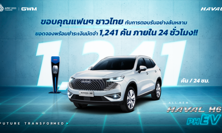 เกรท วอลล์ มอเตอร์ เดินหน้าสร้างปรากฏการณ์สั่นสะเทือนวงการยานยนต์อย่างต่อเนื่อง ภายหลังจากการเปิดตัวและประกาศราคาอย่างเป็นทางการของ All New HAVAL H6 Plug-in Hybrid SUV เมื่อวันศุกร์ที่ 7 ตุลาคม 2565 ที่ผ่านมา ที่ราคา 1,699,000 บาท โดยกวาดยอดจองพร้อมการชำระเงินมัดจำ 10,000 บาทรวมทั้งสิ้น 1,241 คัน ภายในระยะเวลา 24 ชั่วโมง ซึ่งการจองและชำระเงินมัดจำนี้ เริ่มคึกคักและแรงไม่มีแผ่วตั้งแต่เริ่มต้นการเปิดรับจองเพื่อรับส่วนลดพิเศษ 50,000 บาทภายใต้แคมเปญ ULTRA DEAL ครบ 300 คันภายใน 5 นาทีแรก สะท้อนความนิยมของ All New HAVAL H6 Plug-in Hybrid SUV รถยนต์พลังงานไฟฟ้าอัจฉริยะที่สามารถตอบโจทย์การเดินทางของแฟนๆ ชาวไทยได้อย่างมีนัยสำคัญ และตอกย้ำความสำเร็จของ เกรท วอลล์ มอเตอร์ ในฐานะผู้นำด้านยานยนต์พลังงานไฟฟ้า (xEV Leader) ที่มุ่งมั่นนำเสนอผลิตภัณฑ์และบริการคุณภาพ ตลอดจนสร้างสรรค์ประสบการณ์ใหม่ๆ ให้กับผู้บริโภค ควบคู่ไปกับการเติมเต็มความสมบูรณ์แบบให้กับระบบนิเวศยานยนต์ไฟฟ้าของไทยอย่างเต็มรูปแบบ
