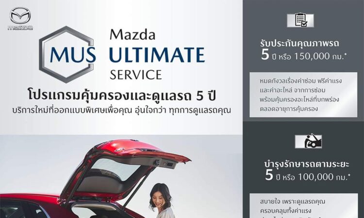 มาสด้ายกระดับคุณภาพการบริการ สร้างมาตรฐานใหม่ในอุตสาหกรรมรถยนต์ไทยในด้านการดูแลลูกค้า เปิดตัวบริการหลังการขายรูปแบบใหม่ระดับพรีเมี่ยม MAZDA ULTIMATE SERVICE (MUS) มอบความอุ่นใจมากยิ่งขึ้นด้วยการเอาใจใส่ดูแลรถยนต์ของลูกค้าตลอดระยะเวลา 5 ปี ไร้ความกังวลกับค่าใช้จ่ายตลอดการคุ้มครอง ฟรีรับประกันคุณภาพรถ ฟรีค่าบำรุงรักษารถตามระยะ ฟรีค่าแรง และฟรีค่าอะไหล่ รวมถึงผลิตภัณฑ์ของเหลว มอบความอุ่นใจตลอดการเดินทางกับบริการช่วยเหลือฉุกเฉิน 24 ชั่วโมง เพื่อความปลอดภัยและลดภาระค่าใช้จ่ายที่จะเกิดขึ้นในอนาคต เพื่อให้ลูกค้าสามารถขับขี่รถยนต์มาสด้าได้อย่างสนุกสนานเร้าใจทุกการเดินทาง โดยสิทธิพิเศษนี้สำหรับลูกค้าที่จองซื้อรถยนต์มาสด้าตั้งแต่เดือนตุลาคมนี้เป็นต้นไป ณ โชว์รูมมาสด้าทั้ง 138 แห่งทั่วประเทศ