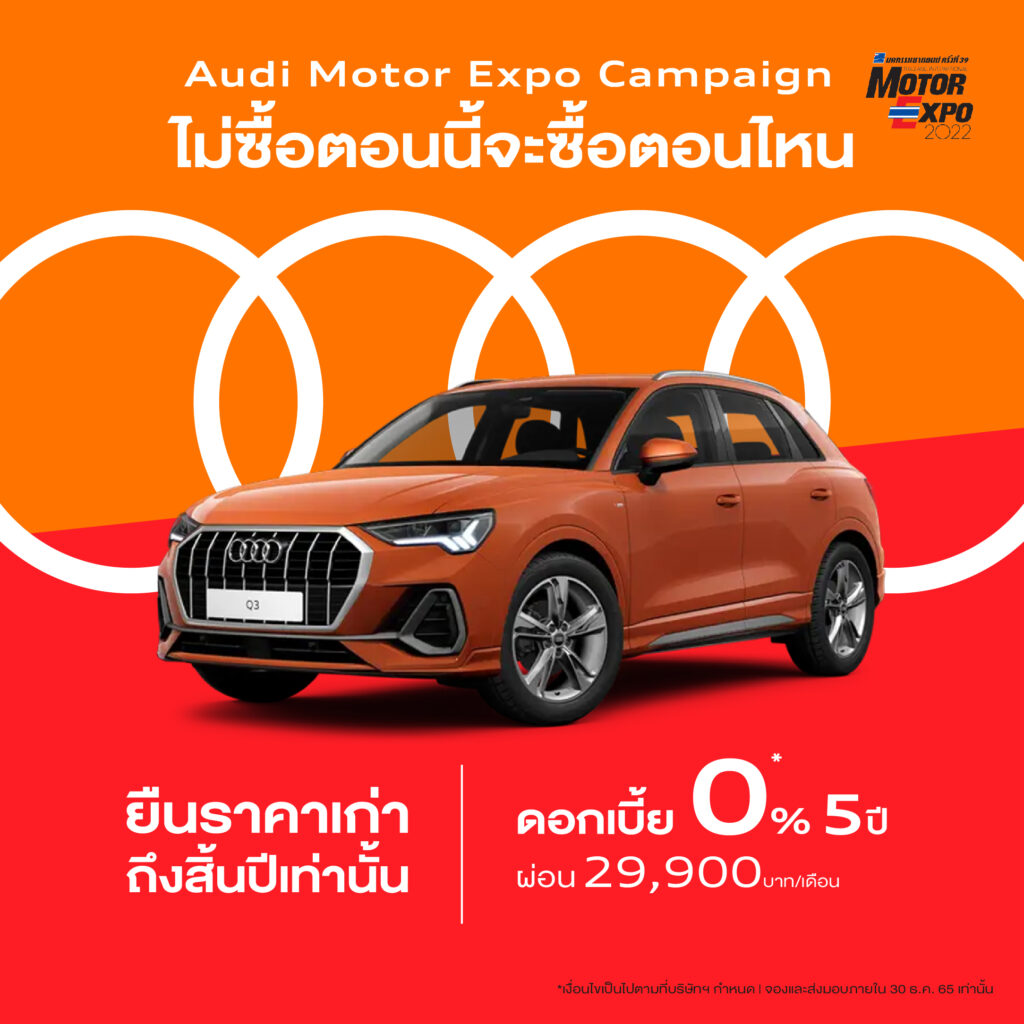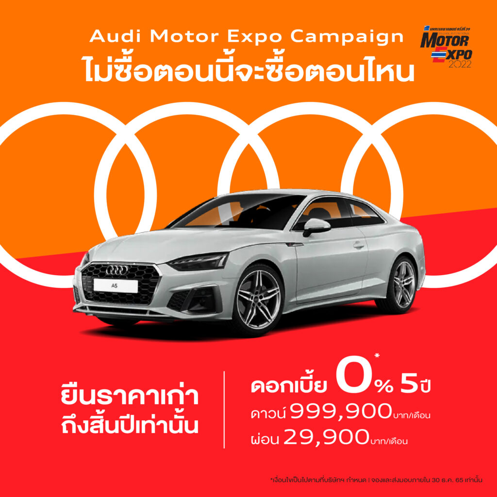 อาวดี้ ประเทศไทย เขย่าตลาดปลายปี โค้งสุดท้ายแรงไม่แพ้ใคร ให้ลูกค้าอาวดี้ ได้เลือกยนตรกรรมอาวดี้ มาขับก่อนใคร ส่งแคมเปญแรงสำหรับงาน Motor Expo ให้กับรุ่นยอดฮิตแล้วตั้งแต่วันนี้ ดอกเบี้ย 0% 5 ปี* ไม่มีดอกเบี้ย ไม่มีบอลลูน ไม่ต้องรอลดต้นลดดอก พร้อมยืนราคาเก่าถึงสิ้นปี 2565 เท่านั้น