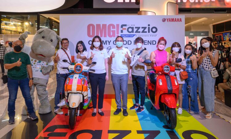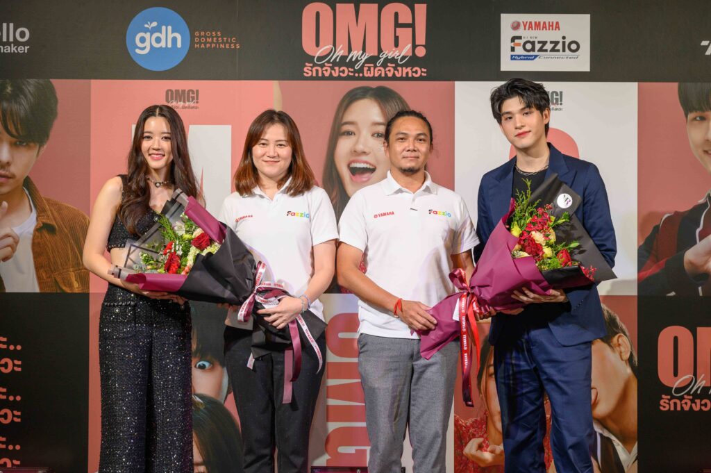 นายจิรภัทร สายเพชร ผู้จัดการทั่วไปฝ่ายการตลาดกลุ่มรถออโตเมติก และสนับสนุนการตลาด นางสาวอัญชลี ศรีพิทักษ์ ผู้จัดการส่วนบริหารตราสินค้า ประชาสัมพันธ์ และลูกค้าสัมพันธ์ บริษัท ไทยยามาฮ่ามอเตอร์ จำกัด ร่วมกันมอบช่อดอกไม้แสดงความยินดีและถ่ายภาพร่วมกับ คุณจินา โอสถศิลป์ ประธานเจ้าหน้าที่บริหาร บริษัท จีดีเอช ห้าห้าเก้า จำกัด และนายฐิติพงศ์ เกิดทองทวี ผู้กำกับภาพยนตร์ “OMG! รักจังวะ…ผิดจังหวะ ”สกาย-วงศ์รวี นทีธร และ “จูเน่-เพลินพิชญา โกมลารชุน” พร้อมด้วยนักแสดงชั้นนำในงาน GALA “OMG! รักจังวะ…ผิดจังหวะ”
