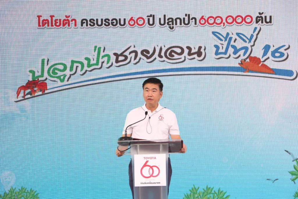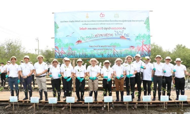 ทั้งนี้ เนื่องในโอกาสที่โตโยต้าได้ดำเนินงานในประเทศไทยครบ 60 ปี โตโยต้าจึงได้ริเริ่มโครงการ “โตโยต้า ครบรอบ 60 ปี ปลูกป่า 600,000 ต้น” เพื่อขยายผลการดูดซับก๊าซคาร์บอนไดออกไซด์ โดยตั้งเป้าในการเพิ่มพื้นที่สีเขียวร่วมกับหน่วยงานท้องถิ่น ตลอดจนพันธมิตรทางธุรกิจต่าง ๆ ให้ครบ 600,000 ต้น ภายในเดือนมีนาคมปี 2566 ซึ่งได้เริ่มต้นจากการปลูกป่า 18,000 ต้น ที่โรงงาน โตโยต้า บ้านโพธิ์ เมื่อเดือนสิงหาคมที่ผ่านมา และต่อยอดมาสู่กิจกรรมปลูกป่าชายเลนในวันนี้ ซึ่งได้รับความร่วมมือจากอาสาสมัครกว่า 3,000 คน ซึ่งประกอบด้วย ตัวแทนจากบริษัทในเครือโตโยต้า กลุ่มพนักงานโตโยต้าและครอบครัว สมาชิกชมรมโตโยต้าจิตอาสา สมาชิกเครือข่าย Facebook Toyota Happiness Club สมาชิก e-TOYOTACLUB ผู้แทนจำหน่ายโตโยต้า ผู้ผลิตชิ้นส่วน ตลอดจนตัวแทนจากหน่วยงานภาครัฐในจังหวัดสมุทรปราการ กองทัพบก และประชาชนทั่วไป ที่มาร่วมแรงร่วมใจปลูกพันธุ์ไม้ชายเลน กว่า 60,000 ต้น