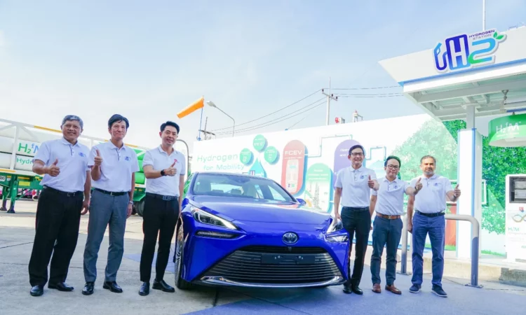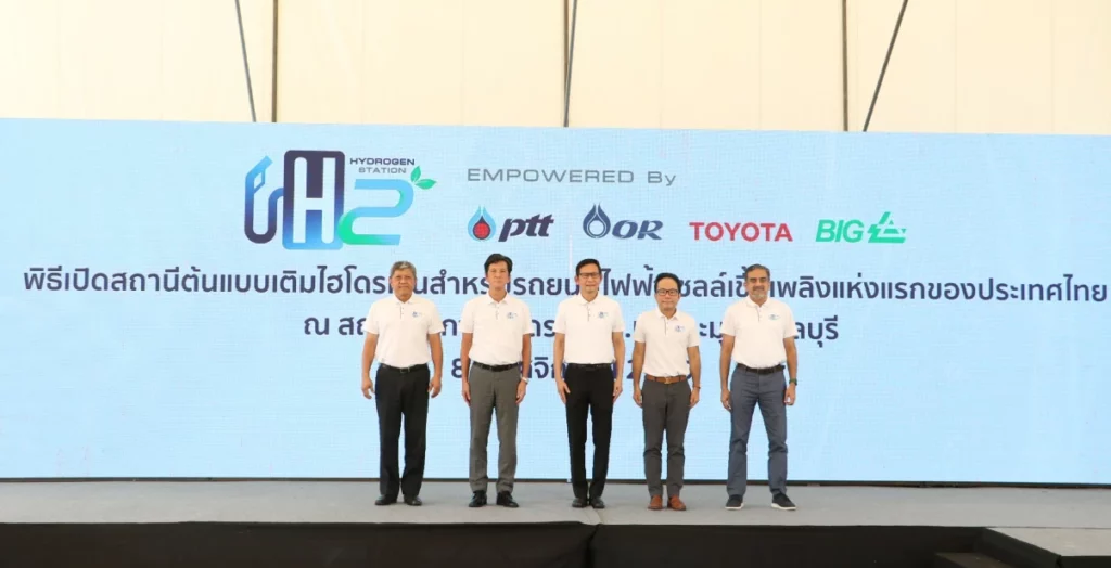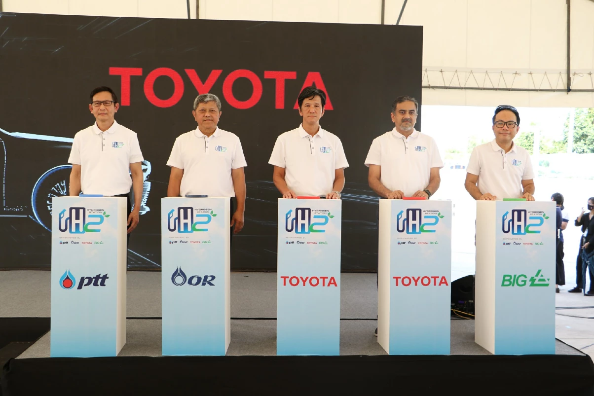 ” นายอรรถพล ฤกษ์พิบูลย์ ” ประธานเจ้าหน้าที่บริหารและกรรมการผู้จัดการใหญ่ บริษัท ปตท. จำกัด (มหาชน) (ปตท.) ” นายวิศาล ชวลิตานนท์ ” รักษาการประธานเจ้าหน้าที่บริหาร บริษัท ปตท.น้ำมันและการค้าปลีก จำกัด (มหาชน) (OR) ” นายปิยบุตร จารุเพ็ญ ” กรรมการผู้จัดการ บริษัท บางกอกอินดัสเทรียลแก๊ส จำกัด (BIG) ” นายปาซานา กาเนซ ” รองกรรมการผู้จัดการใหญ่ บริษัท โตโยต้า ไดฮัทสุ เอ็นจิเนียริ่ง แอนด์ แมนูแฟคเจอริ่ง จำกัด (TDEM) ” นายโนริอากิ ยามาชิตะ ” กรรมการผู้จัดการใหญ่ บริษัท โตโยต้า มอเตอร์ ประเทศไทย จำกัด (TMT) และ ” นายปรเมศวร์ งามพิเชษฐ์ ” นายกเมืองพัทยา ร่วมเปิดสถานีนำร่องทดลองใช้เชื้อเพลิงไฮโดรเจนสำหรับรถยนต์ไฟฟ้าเซลล์เชื้อเพลิง(Fuel Cell Electric Vehicle: FCEV) แห่งแรกของประเทศไทย (Hydrogen Station) ณ อ.บางละมุง จ.ชลบุรี โดยการนำรถยนต์ไฟฟ้าเซลล์เชื้อเพลิงรุ่นมิไร (Mirai) ของโตโยต้า มาเพื่อทดสอบการใช้งานในประเทศไทย ให้บริการในรูปแบบรถรับส่งระหว่างสนามบินอู่ตะเภา จ.ชลบุรี (U-Tapao Limousines) สำหรับนักท่องเที่ยวและผู้โดยสารในพื้นที่พัทยา – ชลบุรี และพื้นที่ใกล้เคียง โดยจะทำการเก็บข้อมูลเชิงเทคนิคที่ได้จากการใช้งานจริง เพื่อสร้างการรับรู้และเป็นข้อมูลรองรับการขยายผลใช้งานในอนาคต