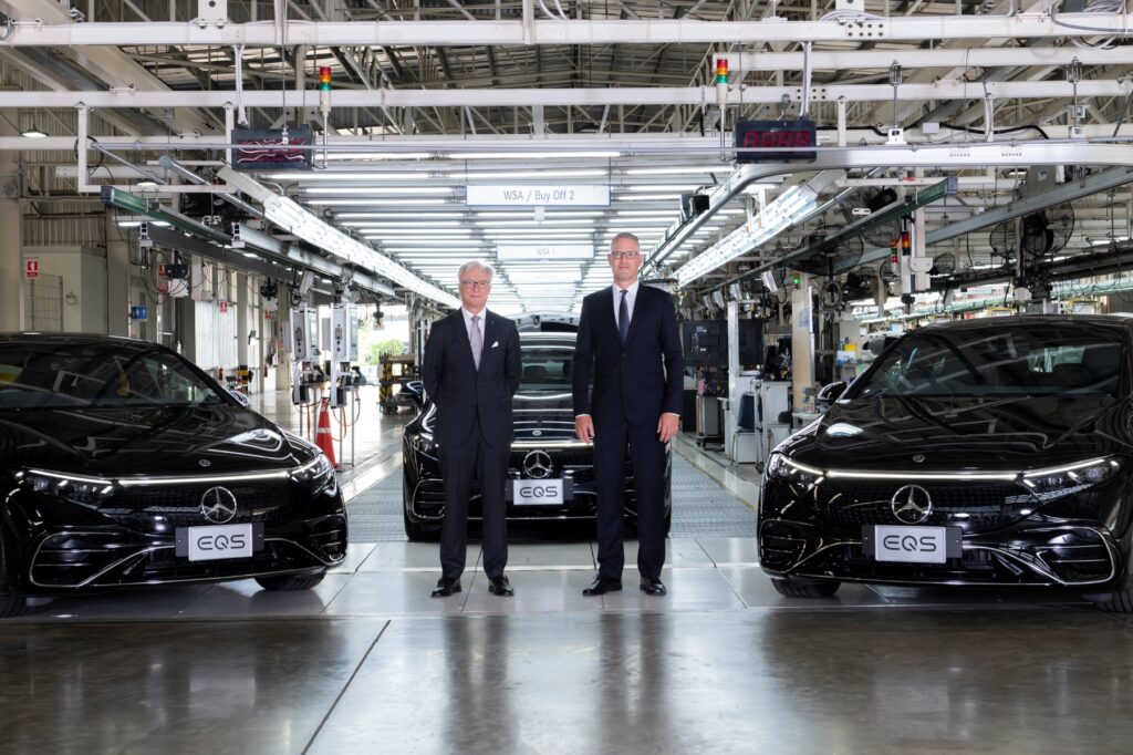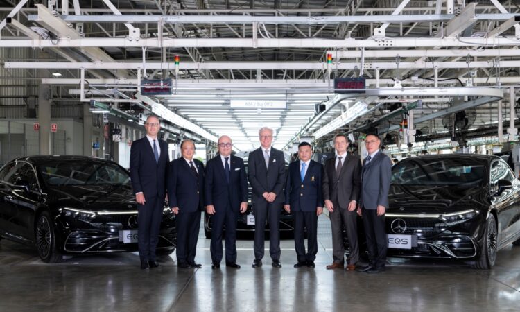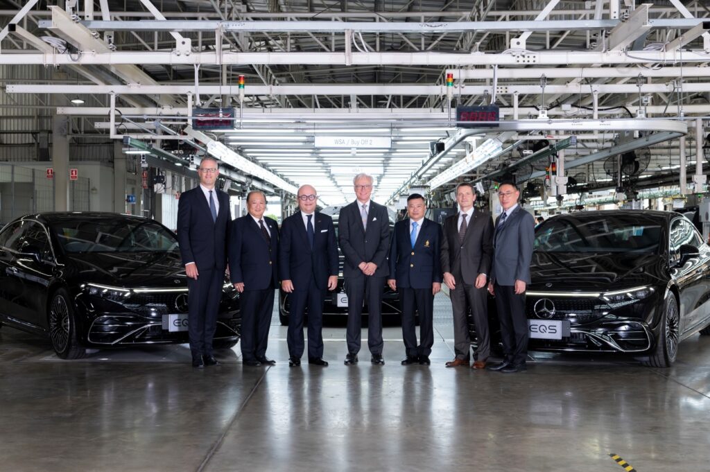 มร. โรลันด์ โฟล์เกอร์ ประธานบริหาร บริษัท เมอร์เซเดส-เบนซ์ (ประเทศไทย) จำกัด และ มร.มาร์ค เบอร์เกอร์ ประธานบริหาร บริษัท เมอร์เซเดส-เบนซ์ แมนูแฟคเจอริ่ง (ประเทศไทย) จำกัด พร้อมทีมผู้บริหารเมอร์เซเดส-เบนซ์ ให้การต้อนรับตัวแทนจากหน่วยงานภาครัฐ นำโดย ม.ล.ชโยทิต กฤดากร ผู้แทนการค้าไทยและที่ปรึกษารองนายกรัฐมนตรี สำนักนายกรัฐมนตรี และนายกฤษฎา ทองธรรมชาติ ผู้อำนวยการสำนักงานศุลกากรกรุงเทพ กรมศุลกากร ที่ให้เกียรติมาร่วมแสดงความยินดีในโอกาสที่เมอร์เซเดส-เบนซ์เปิดตัวรถยนต์ “EQS 500 4MATIC AMG Premium” ยานยนต์พลังไฟฟ้า 100% รุ่นประกอบในประเทศไทย ล็อตแรกจากโรงงานอย่างเป็นทางการ โดยรถยนต์คันนี้รังสรรค์ขึ้นด้วยแพลตฟอร์มของยานยนต์ไฟฟ้าใหม่ในทุกรายละเอียด ทั้งการออกแบบโครงสร้างทางวิศวกรรม เรื่อยไปจนถึงดีไซน์ภายนอกและภายในที่สะท้อนเอกลักษณ์ของความเป็นยานยนต์สำหรับโลกอนาคตจากเมอร์เซเดส-เบนซ์