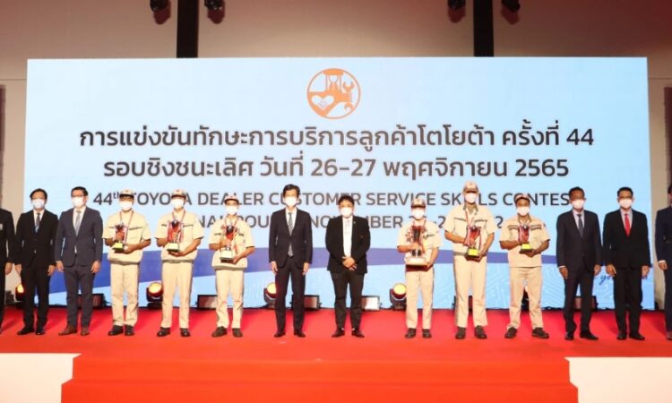 ” มร. โนริอากิ ยามาชิตะ ” กรรมการผู้จัดการใหญ่ บริษัท โตโยต้า มอเตอร์ ประเทศไทยจำกัดร่วมกับ นายเจษฎา จันทร์อุไร ผู้อำนวยการ สำนักพัฒนามาตรฐาน และทดสอบฝีมือแรงงานกรมพัฒนาฝีมือแรงงาน ว่าที่เรือตรีชูชีพ อรุณเหลือง ประธานกรรมการการอาชีวศึกษาภาคตะวันออก และผู้อำนวยการวิทยาลัยเทคนิคระยอง นายศุภชัย แพร่พิพัฒน์มงคล รองประธานชมรมผู้แทนจำหน่าย โตโยต้าพร้อมด้วย คณะผู้บริหารระดับสูง และผู้แทนจำหน่ายโตโยต้า ร่วมเป็นเกียรติในพิธีประกาศผล และมอบรางวัลการแข่งขัน “ทักษะการบริการลูกค้า โตโยต้า” ครั้งที่ 44 ประจำปี 2565 (44th Toyota Dealer Customer Service Skills Contest) รอบชิงชนะเลิศ โดยมีผู้สมัครเข้าร่วมการแข่งขันจากผู้แทนจำหน่ายโตโยต้าทั่วประเทศ 299 คนจาก 99 ผู้แทนจำหน่ายและมีผู้ผ่านเข้าสู่การแข่งขันรอบชิงชนะเลิศ ทั้งช่างเทคนิคระดับพื้นฐาน และระดับสูง 40 คน เมื่อวันที่ 27 พฤศจิกายน 2565 ณ ศูนย์การศึกษาและฝึกอบรมโตโยต้า ถ.สุวินทวงศ์ จ.ฉะเชิงเทรา