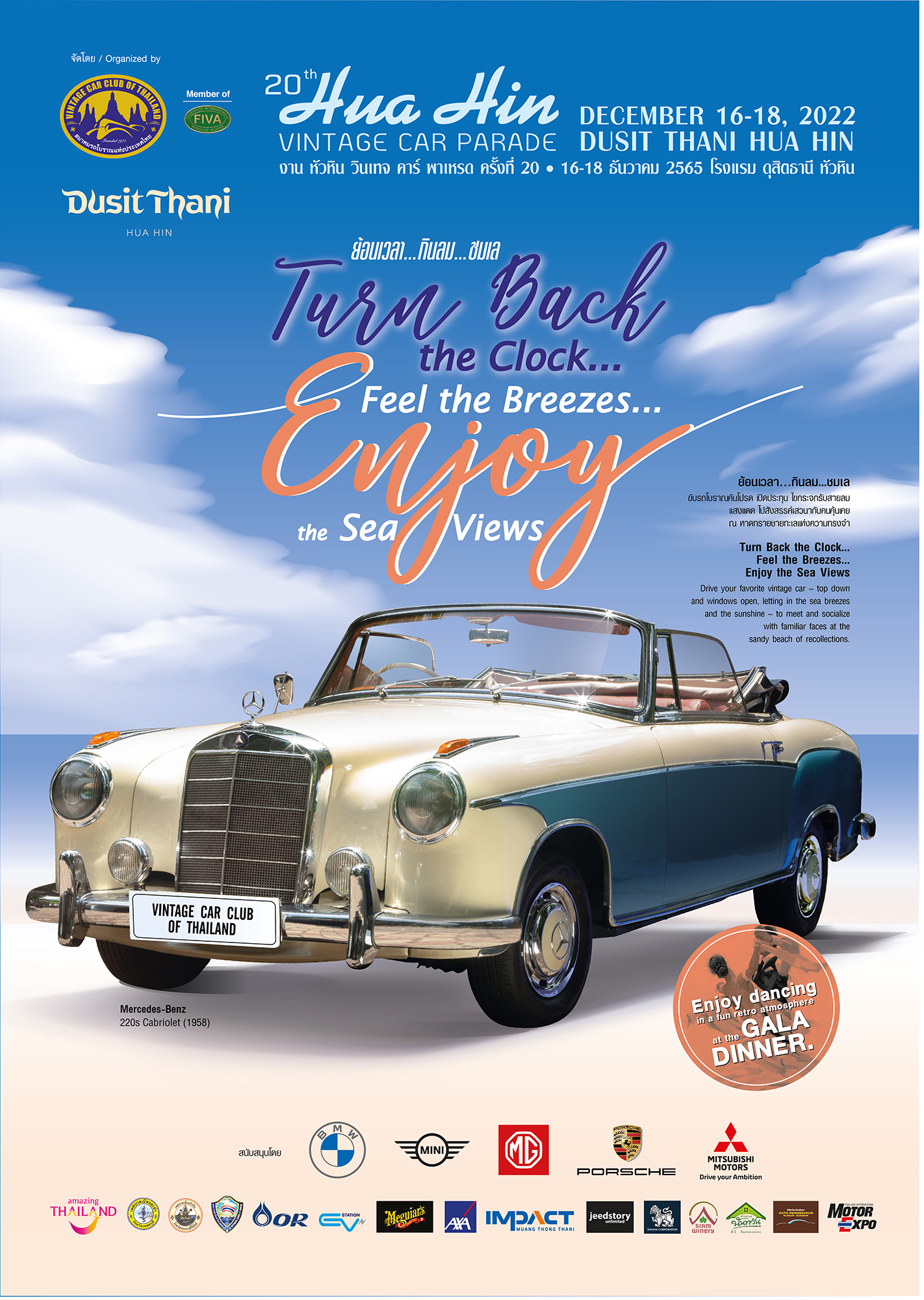 “สมาคมฯ หวังสร้างความคึกคัก กระตุ้นการท่องเที่ยว หลังบรรยากาศซบเซาจากสถานการณ์โรคระบาด โดยประชาชนจะได้ชมขบวนรถโบราณ และรถคลาสสิคที่สวยงามตลอดเส้นทาง กรุงเทพฯ-หัวหิน แนวคิดในการจัดงานครั้งนี้คือ “ย้อนเวลา…กินลม…ชมเล – Turn Back the Clock…Feel the Breezes…Enjoy the Sea Views” เพื่อให้เจ้าของขับรถโบราณคันโปรด เปิดประทุน ไขกระจกรับสายลม แสงแดด ไปสังสรรค์เสวนากับคนคุ้นเคย ณ หาดทรายชายทะเลแห่งความทรงจำ”