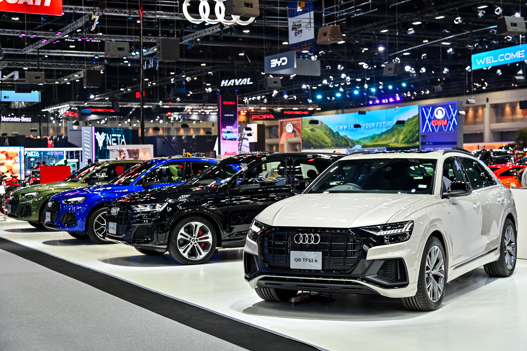 • ตอกย้ำความเป็นผู้นำเทคโนโลยีด้านพลังงานไฟฟ้าด้วยการนำทัพด้วย Audi e-tron GT และขบวนรถยนต์ปลั๊กอินไฮบริดเจเนอเรชั่นล่าสุด ครบ 3 รุ่น ไม่ว่าจะเป็น Q8 60 TFSI e quattro S line Black Edition, Audi Q7 60 TFSI e quattro Plug-in Hybrid พร้อมโชว์โฉม The New Audi Q5 Sportback 55 TFSI e และ Audi Q5 55 TFSI e ทางเลือกที่ลงตัวตอบโจทย์กับไลฟ์สไตล์ยุคใหม่ ด้วยระยะการวิ่งด้วยไฟฟ้าที่เหมาะกับการใช้งานในเมือง สอดคล้องกับโครงสร้างพื้นฐานของประเทศไทย ที่กำลังเปลี่ยนผ่านสู่รถไฟฟ้า 100% อย่างเต็มรูปแบบ