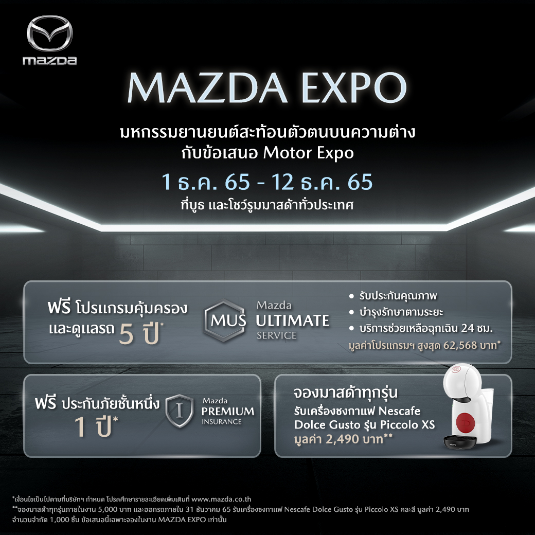 และในโอกาสนี้ มาสด้าขอเชิญชวนลูกค้าและแฟนๆ ที่สนใจเป็นเจ้าของรถยนต์มาสด้าเข้ามาสัมผัสความสง่างามของยนตรกรรมหลากหลายรุ่น พร้อมรับข้อเสนอพิเศษมากมากมาย อาทิ ดาวน์เริ่มต้น 29,900 บาท* ดอกเบี้ย 2.09%* ฟรีประกันภัยชั้น 1 Mazda Premium Insurance* ขยายการรับประกันคุณภาพเป็น 5 ปี หรือ 150,000 กิโลเมตร* และขอมอบการดูแลลูกค้าแบบครบครันตั้งแต่วันแรกที่ออกรถจนถึงบริการหลังการขายตลอดระยะเวลา 5 ปี ด้วยโปรแกรม MAZDA ULTIMATE SERVICE (MUS)* ที่ครอบคลุมทั้ง การรับประกันคุณภาพ ฟรีค่าบำรุงรักษาตามระยะ ฟรีค่าแรง ฟรีค่าอะไหล่ และผลิตภัณฑ์ของเหลว พร้อมบริการช่วยเหลือฉุกเฉินตลอด 24 ชั่วโมง รวมมูลค่าสุดสุด 62,568 บาท* ไม่เพียงเท่านี้ มาสด้ายังได้เตรียมเครื่องชงกาแฟ Nescafe Dolce Gusto มูลค่า 2,490 บาท* เพื่อมอบให้กับลูกค้าที่จองซื้อรถมาสด้าทุกรุ่นภายในงานฯ อีกด้วย ลูกค้าที่สนใจสามารถพบกับข้อเสนอต่างๆ นี้ ได้ที่งาน มอเตอร์ เอ็กซ์โป 2022 หรือรับข้อเสนอเดียวกันนี้ได้ที่โชว์รูมมาสด้าใกล้บ้านทั่วประเทศ