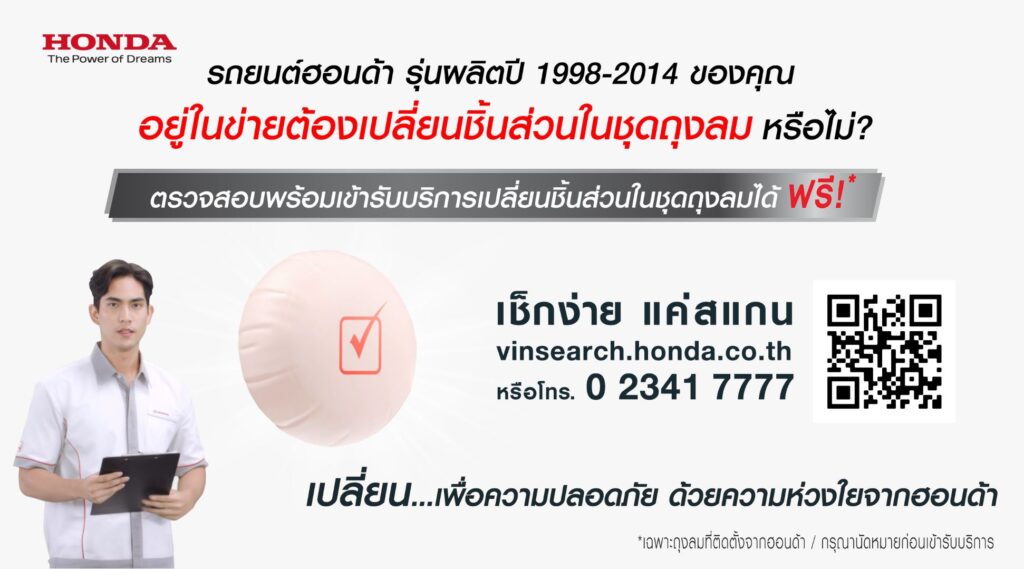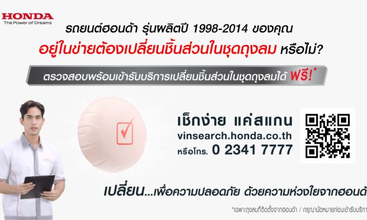 บริษัท ฮอนด้า ออโตโมบิล (ประเทศไทย) จำกัด ตอกย้ำความปลอดภัยในการขับขี่บนท้องถนน แจ้งลูกค้าผู้ใช้รถยนต์ฮอนด้ารุ่นผลิตปี ค.ศ. 1998 – 2014 (พ.ศ. 2541 – 2557) ให้เข้ารับการตรวจสอบรถยนต์ว่าเข้าข่ายต้องเปลี่ยนชิ้นส่วนในชุดถุงลมหรือไม่ โดยสามารถเช็กด้วยตนเองเพียงสแกน QR Code และกรอกหมายเลขตัวถังรถยนต์ หรือผ่านทางเว็บไซต์ https://vinsearch.honda.co.th