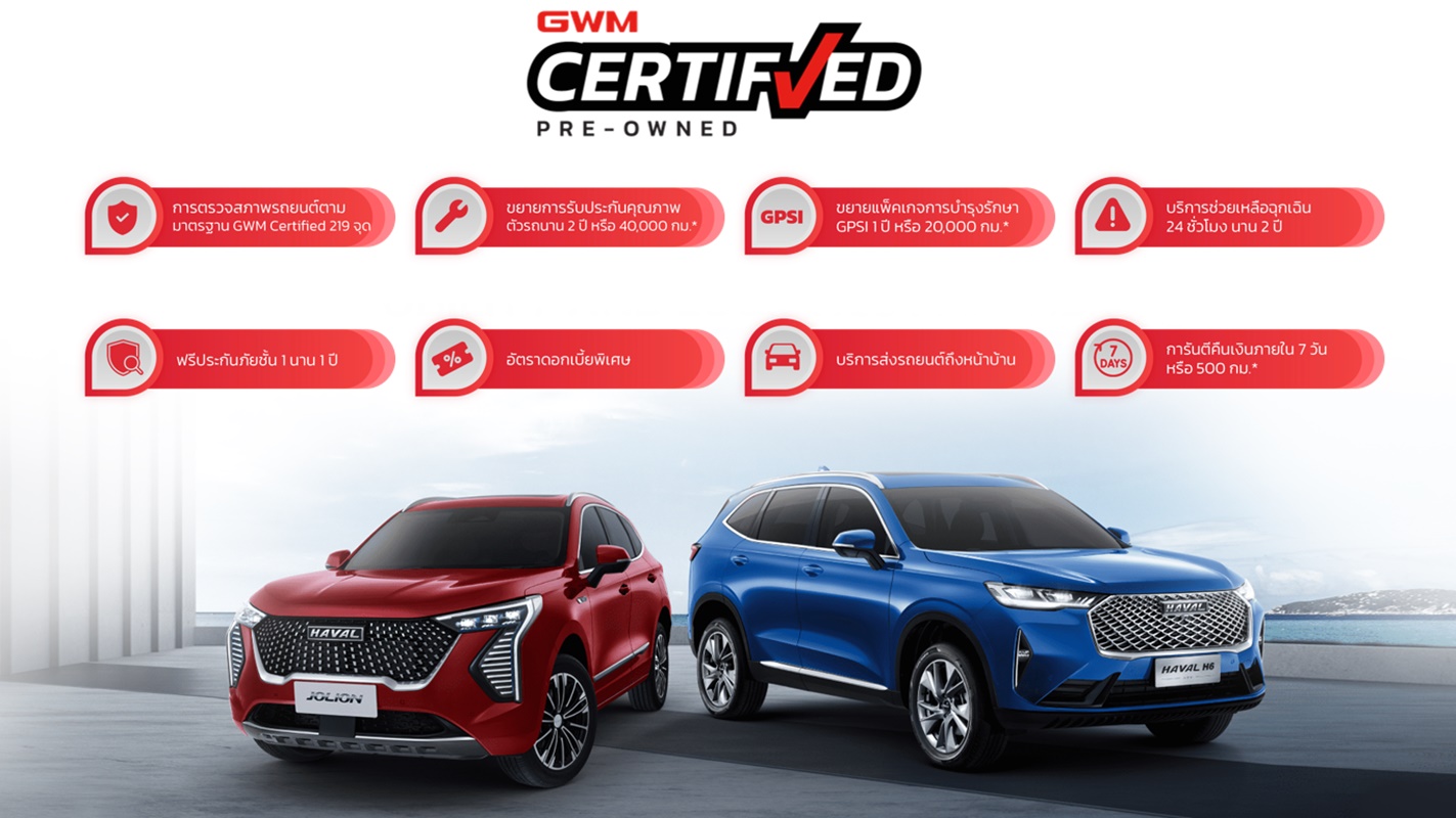 4) ด้านธุรกิจ Used Car: ในปี 2566 เกรท วอลล์ มอเตอร์ จะเปิดดำเนินการธุรกิจรถใช้แล้ว โดยให้บริการลูกค้าอย่างครบวงจร รองรับลูกค้าที่ต้องการเปลี่ยนรถและลูกค้าที่มองหารถยนต์ใช้แล้วที่มีคุณภาพของ เกรท วอลล์ มอเตอร์ รวมทั้งมีบริการประเมินราคารถใช้แล้วง่ายๆ ผ่านทางเว็บไซต์ WWW.GWM.CO.TH โดยมาตรฐานรถใช้แล้วของ GWM Certified Pre-Owned ประกอบไปด้วย 4 ส่วน คือ การตรวจสอบคุณภาพตามมาตรฐาน 219 จุด อายุรถไม่เกิน 5 ปี เลขไมล์ไม่เกิน 150,000 กิโลเมตร ไม่มีประวัติน้ำท่วม ไฟไหม้ และไม่มีประวัติชนหนัก ซึ่งมาพร้อมกับสิทธิประโยชน์มากมาย อาทิ