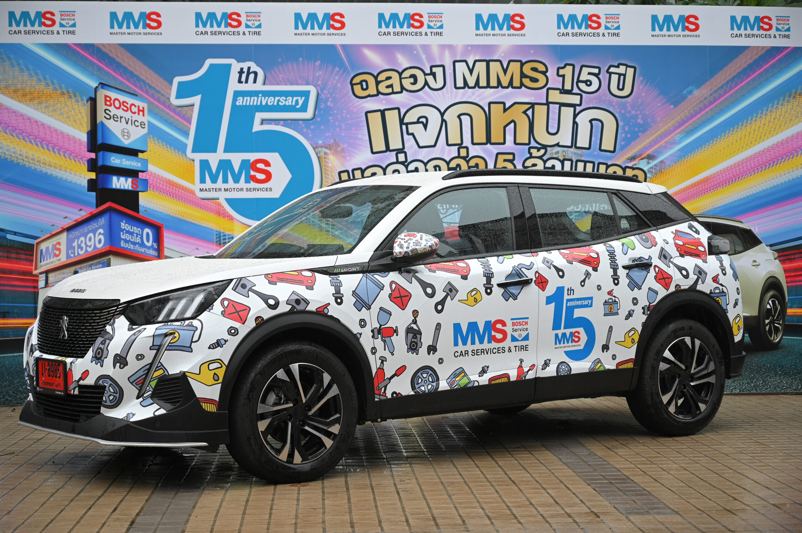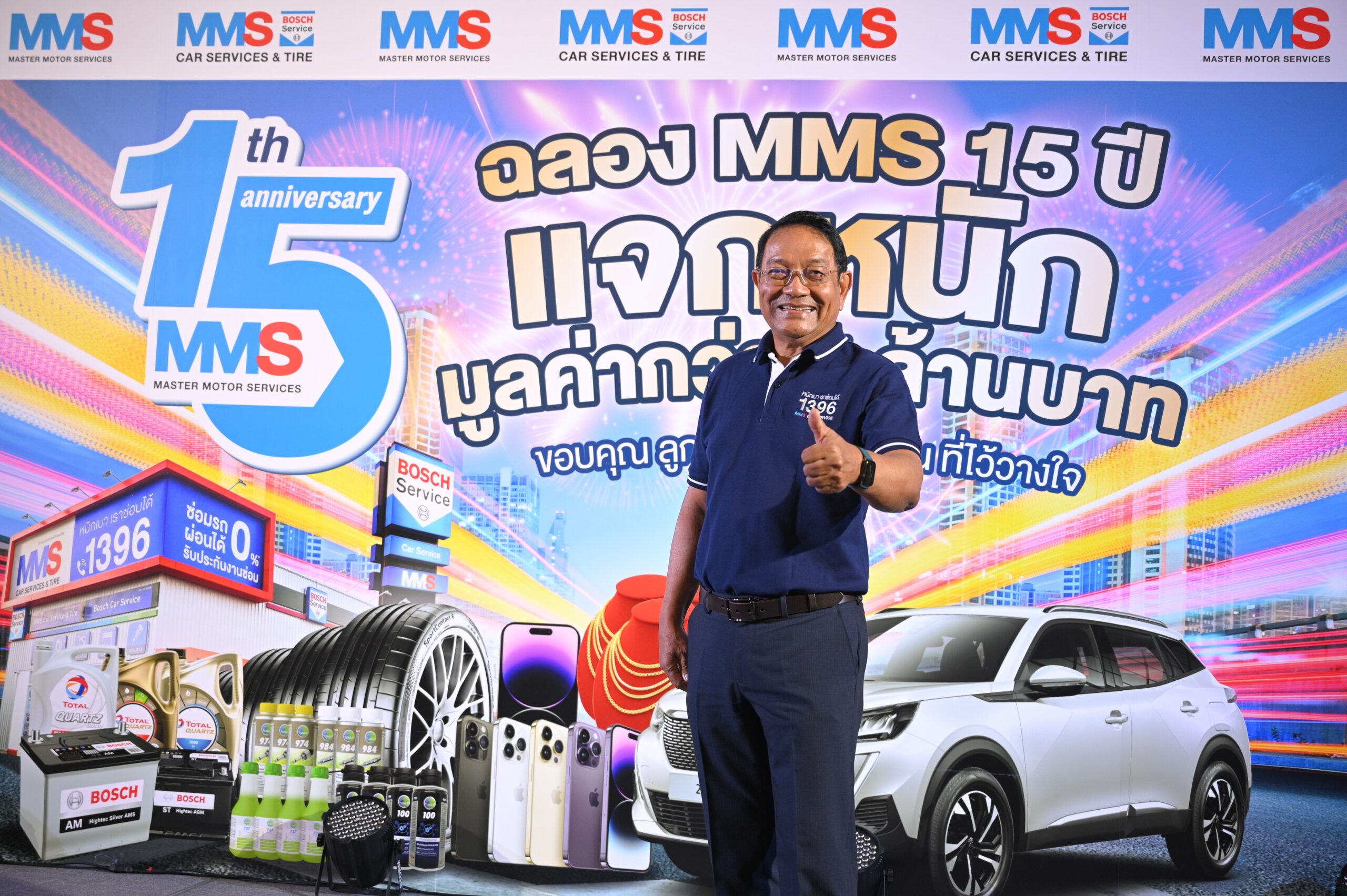 โอกาสพิเศษฉลองครบ 15 ปี เอ็มเอ็มเอส บ๊อช คาร์ เซอร์วิส แอนด์ ไทร์ ใจป้ำจัดแคมเปญยิ่งใหญ่ ให้ลูกค้าได้ลุ้นรับ รถยนต์ เปอโยต์ 2008*, สร้อยคอทองคำ*, iPhone 14*, แบตเตอรี่ BOSCH* ยาง Continental* น้ำมันเครื่อง TOTAL* ผลิตภัณฑ์ดูแลรักษารถยนต์ TUNAP* จากประเทศเยอรมนี รวมถึงบัตรกำนัลจาก ซิกท์ รถเช่า* และอื่นๆ รวมมูลค่ากว่า 5 ล้านบาท เพียงเข้ามาใช้บริการที่ เอ็มเอ็มเอส บ๊อช คาร์ เซอร์วิส แอนด์ ไทร์ ทุกสาขา ครบ 4,500 บาท โดยมีการจับรางวัลย่อยทุก 2 เดือน ตั้งแต่ 15 มีนาคม ถึง 14 พฤศจิกายน 2566