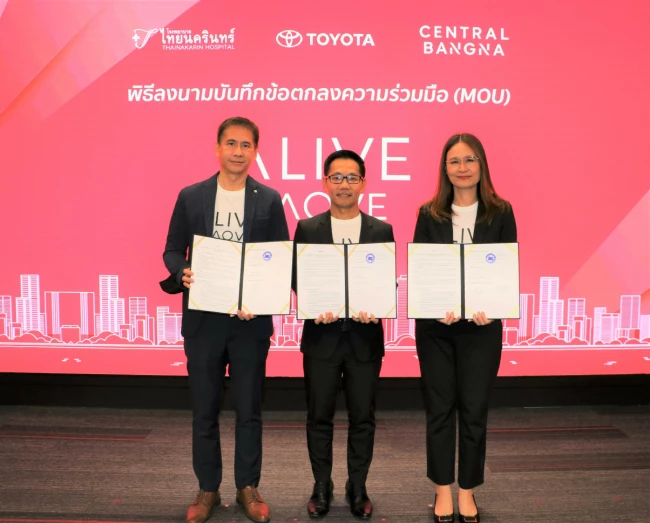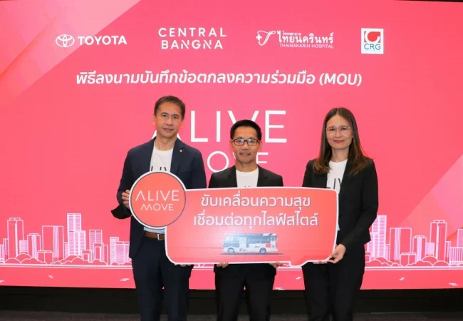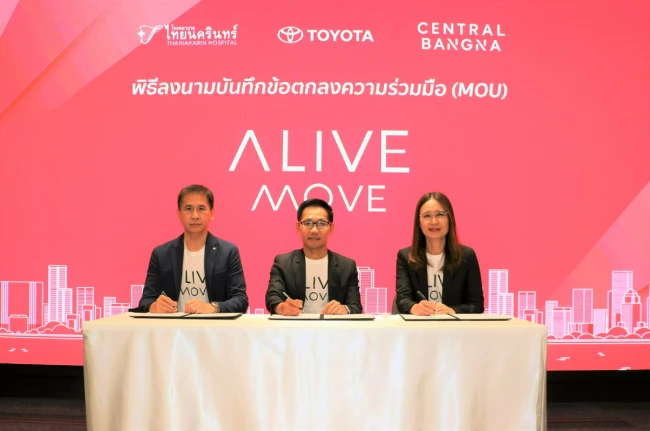 นายศุภกร รัตนวราหะ รองกรรมการผู้จัดการใหญ่ บริษัท โตโยต้า มอเตอร์ ประเทศไทย จำกัด ร่วมกับ นายฐิติ สิหนาถกถากุล ประธานบริหาร โรงพยาบาลไทยนครินทร์ และนางสาวธนัชชพร พงษ์เย็น ผู้จัดการทั่วไป ศูนย์การค้า เซ็นทรัล บางนา ร่วมลงนามบันทึกข้อตกลงเปิดตัวบริการรูปแบบใหม่ “ALIVE MOVE” ผนึกกำลังร่วมมือกันเพื่อสร้างสรรค์สิ่งดีๆ แก่สังคมไทย แบ่งปันประสบการณ์การเดินทางผ่านการให้บริการขนส่งมวลชน เพื่อเป็นประโยชน์ต่อสังคมโดยรวม แก้ปัญหาการขนส่ง และอำนวยความสะดวกของคนในเมือง เชื่อมต่อทุกไลฟ์สไตล์แบบ ไร้รอยต่อ พร้อมสิทธิประโยชน์มากมายจากพันธมิตร ทั้ง เซ็นทรัล ผู้นำห้างสรรพสินค้าที่เป็นแหล่งไลฟ์สไตล์ ทั้งกิน เที่ยว ชอป และ โรงพยาบาลไทยนครินทร์ ผู้นำการให้บริการด้านสุขภาพ เมื่อวันที่ 24 กุมภาพันธ์ ณ TOYOTA ALIVE SPACE บางนา