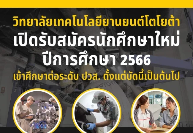 วิทยาลัยเทคโนโลยียานยนต์โตโยต้า เปิดรับสมัครนักศึกษาใหม่ เข้าศึกษาระดับประกาศนียบัตรวิชาชีพชั้นสูง (ปวส.) ปีการศึกษา 2566 ภายใต้หลักสูตรอาชีวศึกษา ร่วมกับหลักสูตรการอบรมตามมาตราฐาน บริษัท โตโยต้า มอเตอร์ คอร์ปอเรชั่น ประเทศญี่ปุ่น