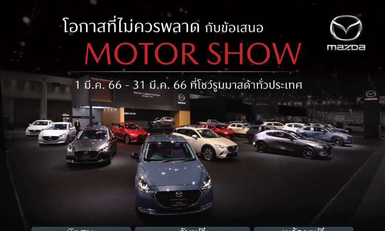 มาสด้ารุดหน้ากระตุ้นตลาดมอบโอกาสที่ไม่ควรพลาด กับข้อเสนอ MOTOR SHOW ตลอดเดือนมีนาคม ระหว่างวันที่ 1 – 31 มีนาคม 2566 ดอกเบี้ยต่ำสุด 0%* ฟรีประกันภัยชั้น 1* และฟรีโปรแกรมคุ้มครองและดูแลรถ 5 ปี* ที่โชว์รูมมาสด้าทั่วประเทศ และประกาศความพร้อมเตรียมบุกงาน มอเตอร์ โชว์ 2023 ด้วยการจัดแสดงยนตรกรรมไฮไลต์สุดพิเศษ ที่มาพร้อม Multi-solution Technology หนึ่งในผลิตภัณฑ์เทคโนโลยีแห่งอนาคตจากมาสด้า ออกสู่สาธารณชนเป็นครั้งแรก พร้อมด้วยทัพรถยนต์ภายใต้เทคโนโลยีสกายแอคทีฟและการออกแบบ โคโดะ ดีไซน์ จากมาสด้าทุกรุ่นที่บูธมาสด้า ในงาน มอเตอร์ โชว์ 2023 ระหว่างวันที่ 22 มี.ค. 66 – 2 เม.ย. 66 นี้เท่านั้น ซึ่งลูกค้าและแฟนๆ มาสด้าไม่ควรพลาดเป็นอย่างยิ่ง