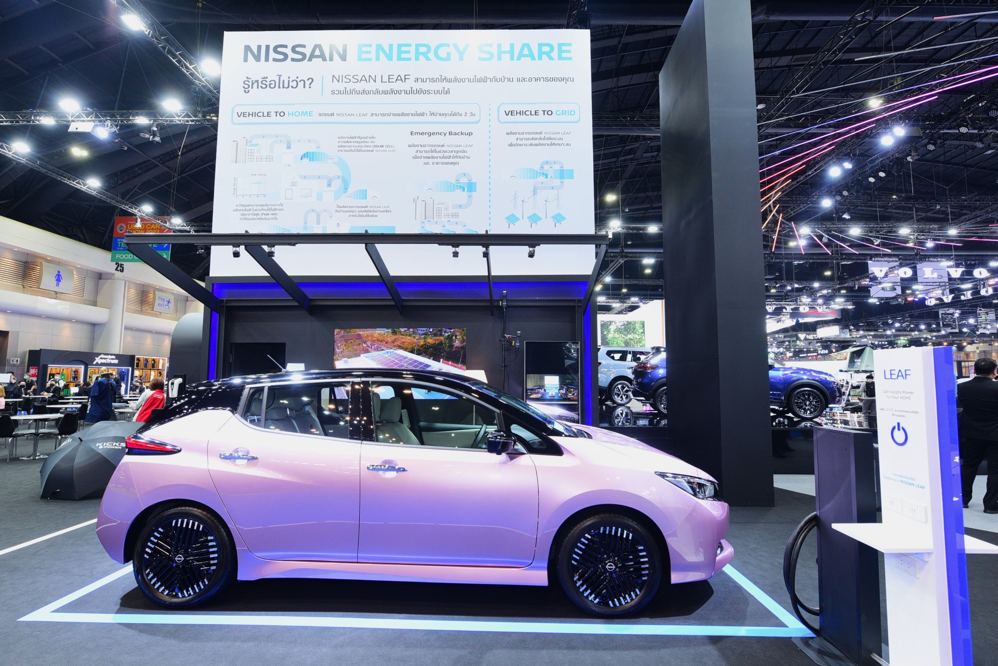 ในฐานะผู้นำเทคโนโลยียานยนต์ไฟฟ้าระดับโลก นิสสันนำ นิสสัน ลีฟ รถยนต์ระบบขับเคลื่อนไฟฟ้า 100% มาสาธิตให้เห็นว่ารถยนต์ไฟฟ้าสามารถสร้างประโยชน์ได้มากกว่าเป็นยานพาหนะเพื่อการเดินทาง ตามแนวคิด Energy Share ของนิสสัน ในโซนเทคโนโลยียานยนต์ไฟฟ้า นิสสันจัดแสดงนิสสัน ลีฟ และการใช้งานระบบชาร์จไฟสองทาง (Bi-directional charge) ในการจ่ายกระแสไฟฟ้าจากรถยนต์สู่ระบบไฟฟ้าในบ้าน (vehicle-to-home หรือ V2H) และสู่ระบบจ่ายกระแสไฟฟ้า (vehicle-to-grid หรือ V2G) เพื่อให้ผู้เข้าชมงานได้เห็นประโยชน์จากการใช้รถยนต์ไฟฟ้าในรูปแบบอื่น โดยผ่านตัวอย่างจากลูกค้านิสสัน ลีฟ ที่ได้ร่วมโครงการการศึกษานี้ ซึ่งที่ผ่านมานิสสันได้ร่วมมือกับการไฟฟ้าฝ่ายผลิตในการศึกษาโครงการแปลงพลังงานไฟฟ้าจากรถยนต์ไฟฟ้าสู่ระบบโครงข่ายไฟฟ้า โดยผลการศึกษานี้จะเป็นประโยขน์ต่อการพัฒนาอย่างยั่งยืนในสังคมในอนาคต ซึ่งเป็นครั้งแรกของรถยนต์ไฟฟ้าแบบ BEV