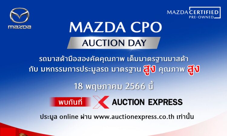 นอกจากนี้ ในวันที่ 18 พ.ค. 66 มาสด้ายังได้ร่วมกับ อ็อคชั่น เอ็กซ์เพรส จัดมหกรรมการประมูลรถยนต์จากโครงการ Mazda CPO Auction Day ชวนลูกค้าร่วมประมูลรถยนต์มาสด้ามือสองคัดคุณภาพที่ผ่านการรับรองมาตรฐาน เพื่อให้ลูกค้าเข้าถึงช่องทางการซื้อรถมาสด้ามือสองที่มีคุณภาพได้อย่างทั่วถึงยิ่งขึ้น ตอกย้ำถึงความพร้อมในการเดินหน้าสู่การเติบโตอย่างยั่งยืน แสดงให้เห็นถึงคุณภาพรถยนต์ใช้แล้วที่อัดแน่นด้วยคุณภาพมาตรฐานเทียบเท่ากับตลาดรถมือสองระดับพรีเมี่ยมในประเทศไทย ภายหลังประสบความสำเร็จจากการริเริ่มโครงการ Mazda Certified Pre-Owned (Mazda CPO) ที่ได้รับความนิยมอย่างสูงและมียอดขายเติบโตกว่า 300% ในเวลาเพียงแค่ 1 ปี พร้อมจัดโปรโมชั่นพิเศษให้ลูกค้ามาสด้าโดยเฉพาะ เพียงลงทะเบียนเข้าร่วมการประมูล* ผ่านเว็บไซต์ www.mazda.co.th จะรับได้รับการยกเว้นค่ามัดจำการประมูล 20,000 บาท โดยการประมูลจะจัดขึ้นผ่านช่องทางออนไลน์ที่ www.auctionexpress.co.th เท่านั้น ผู้ที่สนใจสามารถสอบถามรายเอียดเพิ่มเติมได้ที่ 02-030-5666 หรือสามารถเข้าไปชมรถล่วงหน้าได้ที่เว็บไซต์ อ็อคชั่น เอ็กซ์เพรส โดยตรง