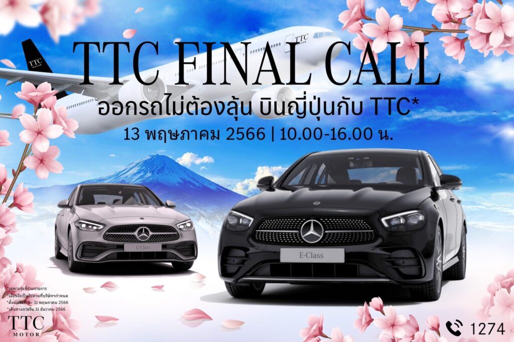 TTC Motor พร้อมส่งแคมเปญ ‘TTC FINAL CALL’ สำหรับลูกค้าตลอดเดือนพฤษภาคมนี้ รับตั๋วเครื่องบินไป-กลับญี่ปุ่น ทันทีเมื่อออกรถ Mercedes-Benz รุ่นใดก็ได้ กับข้อเสนอสุดท้ายที่เชิญชวนพบ E 300 AMG Dynamic ดอกเบี้ย 0% นาน 6ปี ฟรีประกันภัย MB Protection 1 ปี หรือ C 350e AMG Dynamic ดาวน์เพียง 5xx,xxx ผ่อน 3x,xxx ฟรีประกันภัย MB Protection 2 ปี หรือ CLS 220d AMG Premium ดาวน์ 7xx,xxx ผ่อน 4x,xxx ฟรีประกันภัย MB Protection 2 ปี พร้อมพบกับ TTC Roadshow ง่ายๆใกล้บ้านคุณ อาทิ ซีคอนสแควร์ เซ็นทรัลเวิล์ด และเมก้าบางนา รวมทั้งกิจกรรมอีกมากมายที่โชว์รูม ในวันเสาร์ที่ 13 และ 20 พฤษภาคมนี้