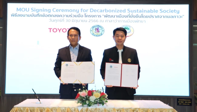 นายสุรภูมิ อุดมวงศ์ รองกรรมการผู้จัดการใหญ่ บริษัท โตโยต้า มอเตอร์ ประเทศไทย จำกัด พร้อมด้วย นายปรเมศวร์ งามพิเชษฐ์ นายกเมืองพัทยา และนายเรวัฒน์ เซี่ยงฉิน ประธานกรรมการ สหกรณ์เดินรถพัทยา จำกัด ร่วมในพิธีลงนามความร่วมมือ “โครงการพัฒนาเมืองต้นแบบที่ยั่งยืนปราศจากมลภาวะ” ณ ศาลาว่าการเมืองพัทยา เมื่อวันศุกร์ที่ 30 มิถุนายน 2566 ที่ผ่านมา