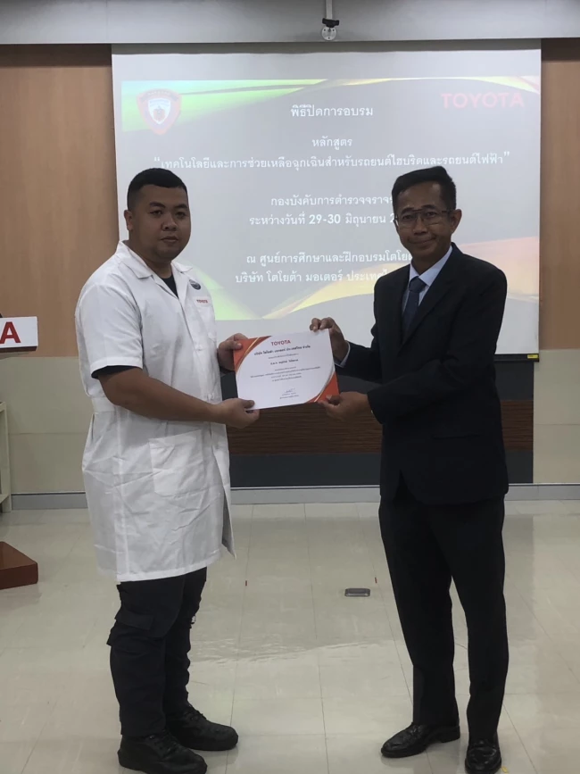 นายรุ่งโรจน์ ขันชะลี ผู้ช่วยกรรมการผู้จัดการใหญ่ สายงานบริการลูกค้า บริษัท โตโยต้า มอเตอร์ ประเทศไทย จำกัด ในนาม ศูนย์การศึกษาและฝึกอบรมโตโยต้า รับมอบประกาศนียบัตรขอบคุณจาก พ.ต.อ.จิรกฤต จารุภัทร์ รองผู้บังคับการตำรวจจราจร จากการสนับสนุนอบรมหลักสูตรเทคโนโลยี การช่วยเหลือฉุกเฉินสำหรับรถยนต์ไฮบริด และรถยนต์ไฟฟ้า ให้กับเจ้าหน้าที่ตำรวจจากกองบังคับการตำรวจจราจร ทั้ง 5 หน่วยงานทั่วประเทศ ประกอบด้วย งานสายตรวจ งานศูนย์ควบคุมการจราจร งานตรวจพิสูจน์ผู้ขับขี่ และ ตำรวจจราจรตามโครงการพระราดำริ เมื่อวันที่ 29-30 มิถุนายน ที่ผ่านมา ณ ศูนย์การศึกษาและฝึกอบรมโตโยต้า ถ.สุวินทวงศ์