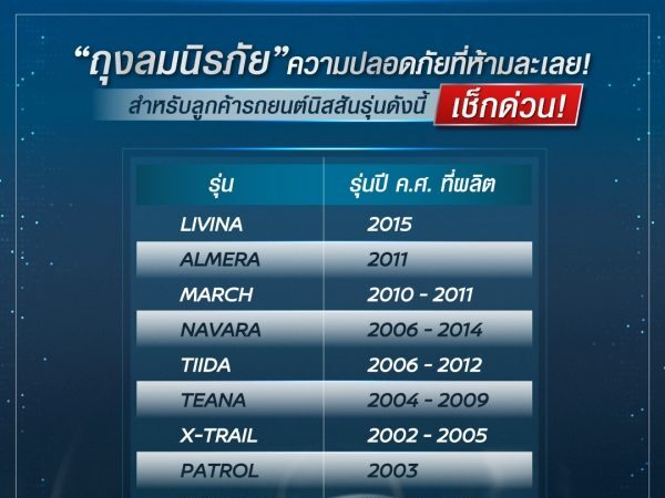 ทั้งนี้ ลูกค้าสามารถตรวจสอบสถานะ “การเปลี่ยนถุงลมนิรภัย ทาคาตะ” ได้ที่ เว็บไซต์นิสสันhttps://www.nissan.co.th/owners/recall-nissan.html โดยการกรอกหมายเลขตัวถังรถ (VIN NO.) ของท่านเพื่อทำการตรวจสอบ