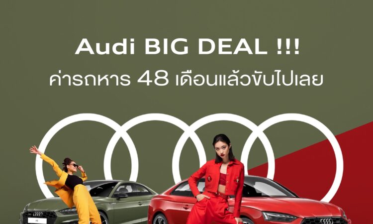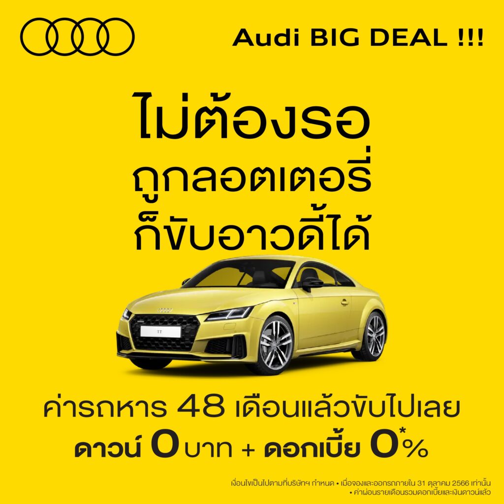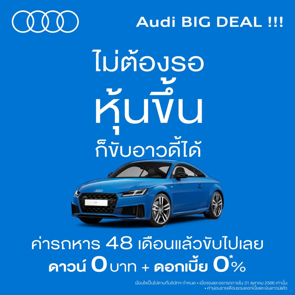 อาวดี้ จัดแคมเปญแรง ข้อเสนอสุดพิเศษ Audi BIG DEAL!!! ออกรถอาวดี้ตั้งแต่วันนี้จนถึง 31 ตุลาคมนี้ รับข้อเสนอ ดาวน์ 0 บาท และดอกเบี้ย 0% นาน 4 ปี ไม่ต้องมีเงินดาวน์และไม่มีดอกเบี้ย ลูกค้าที่สนใจสามารถผ่อนชำระค่างวด โดยนำราคารถหาร 48 งวด ได้เลย