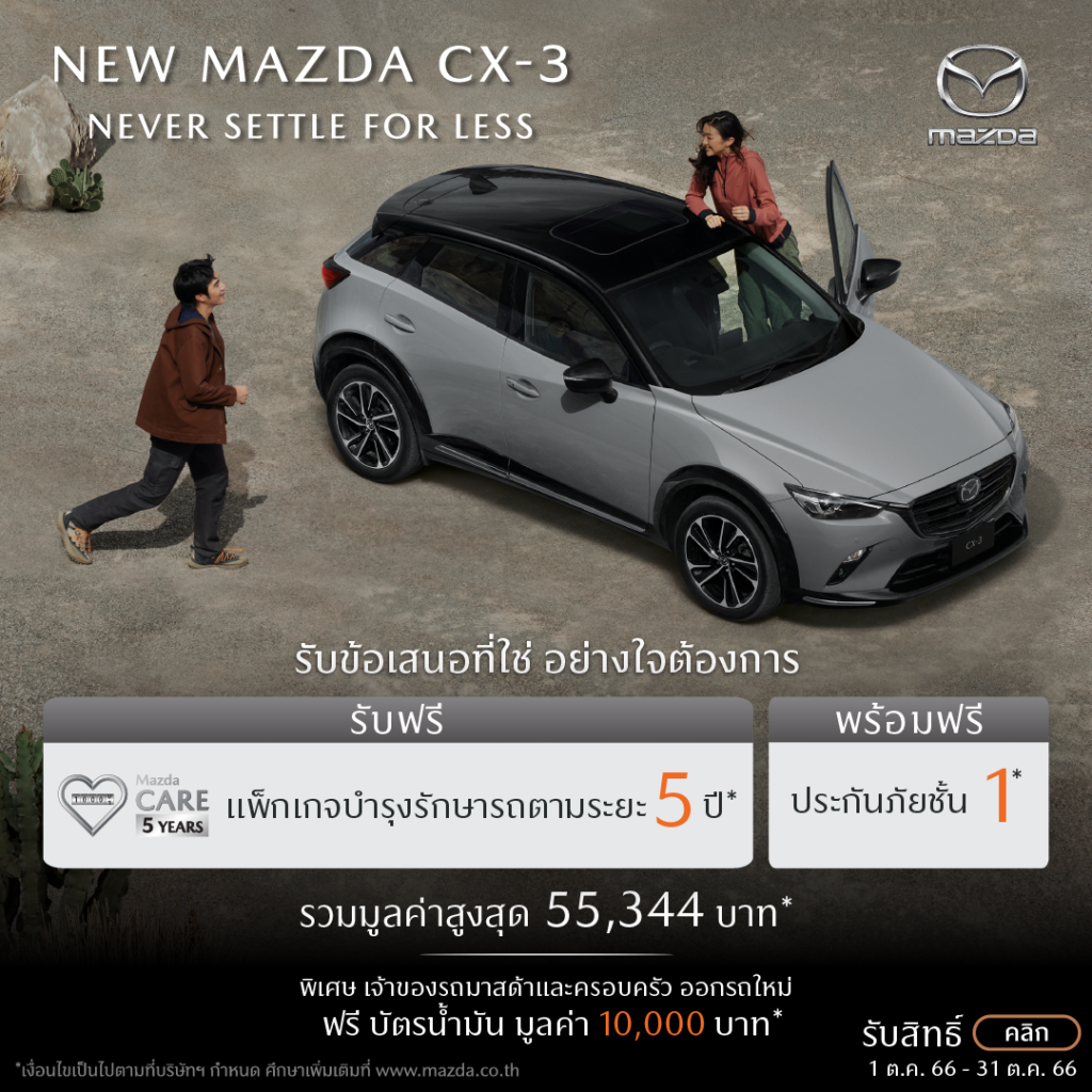 New Mazda CX-3: ดอกเบี้ย 2.39%, ฟรีประกันภัยชั้นหนึ่ง Mazda Premium Insurance 1 ปี, ฟรีแพ็กเกจบำรุงรักษารถตามระยะ Mazda Care 5 ปี (รวมค่าแรง ค่าอะไหล่ และของเหลว) หรือ ดอกเบี้ย 1.19%, ฟรีประกันภัยชั้นหนึ่ง Mazda Premium Insurance 1 ปี
