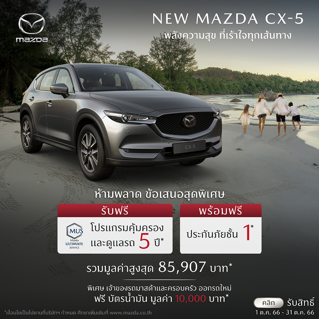 Mazda CX-5: ดอกเบี้ย 2.39%, ฟรีประกันภัยชั้นหนึ่ง Mazda Premium Insurance 1 ปี, ฟรีโปรแกรมคุ้มครองและดูแลรถ 5 ปี Mazda Ultimate Service (MUS) หรือ ดอกเบี้ย 1.39%, ฟรีประกันภัยชั้นหนึ่ง Mazda Premium Insurance 1 ปี