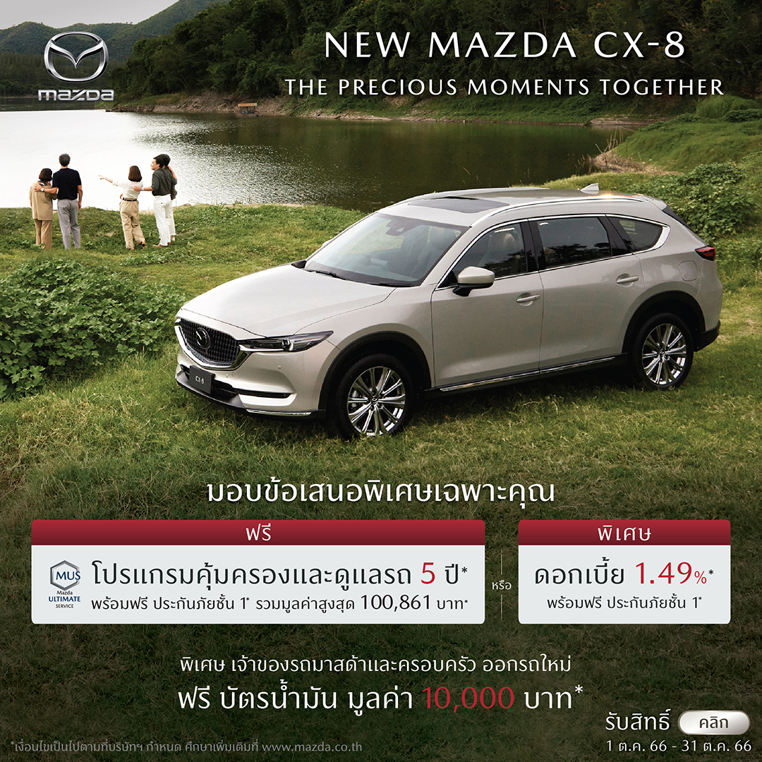 Mazda CX-8: ดอกเบี้ย 2.39%, ฟรีประกันภัยชั้นหนึ่ง Mazda Premium Insurance 1 ปี, ฟรีโปรแกรมคุ้มครองและดูแลรถ 5 ปี Mazda Ultimate Service (MUS) หรือ ดอกเบี้ย 1.49%, ฟรีประกันภัยชั้นหนึ่ง Mazda Premium Insurance 1 ปี