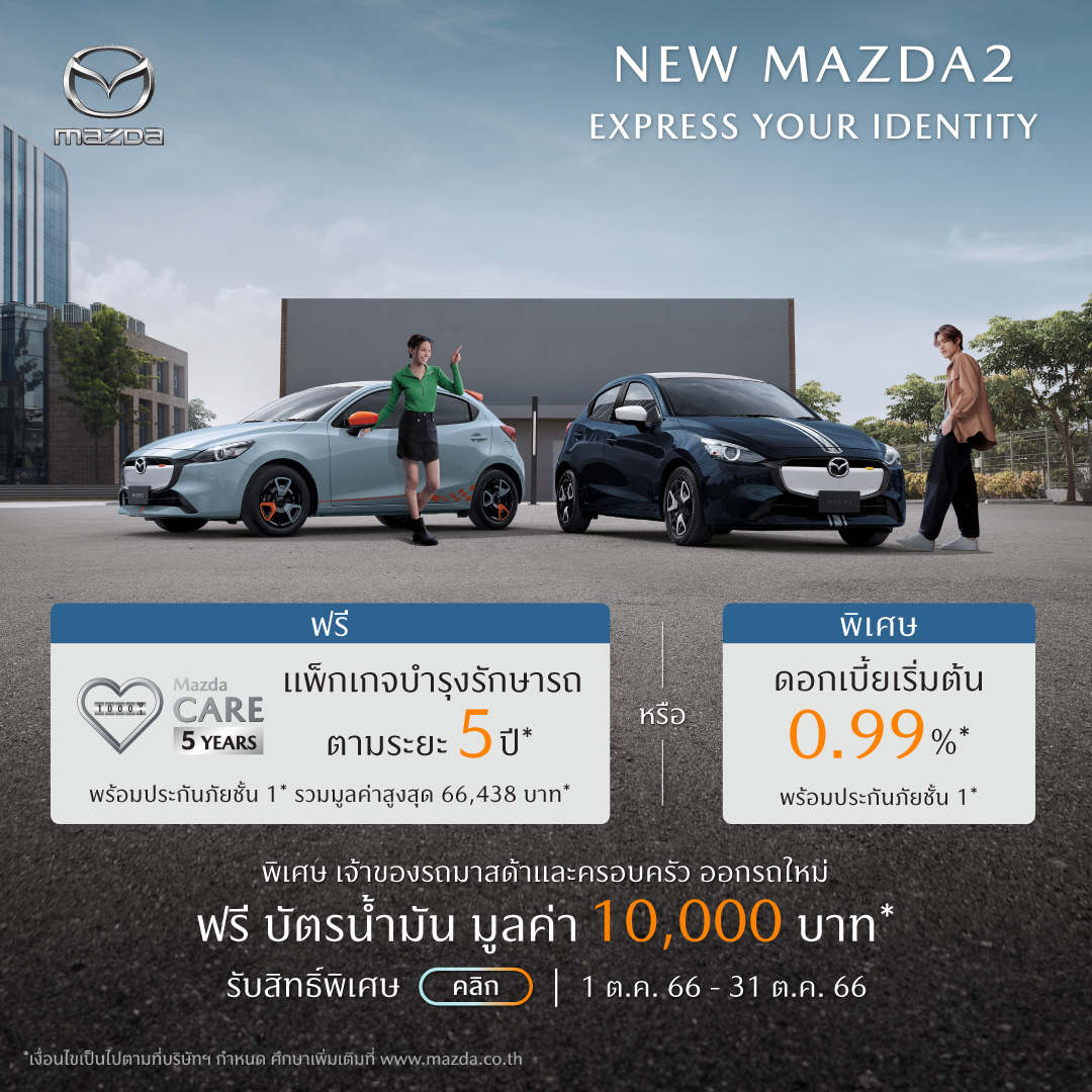 New Mazda2: ดอกเบี้ย 2.39%, ฟรีประกันภัยชั้นหนึ่ง Mazda Premium Insurance 1 ปี, ฟรีแพ็กเกจบำรุงรักษารถตามระยะ Mazda Care 5 ปี (รวมค่าแรง ค่าอะไหล่ และของเหลว) หรือ ดอกเบี้ย 0.99%, ฟรีประกันภัยชั้นหนึ่ง Mazda Premium Insurance 1 ปี