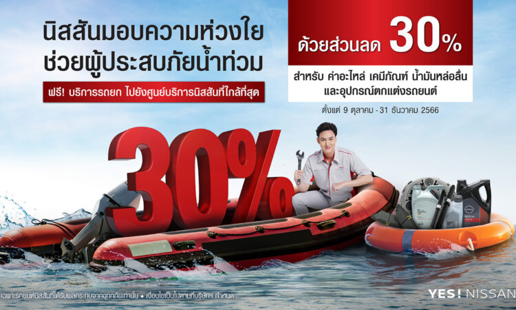 แคมเปญ “นิสสันร่วมใจช่วยผู้ประสบภัยน้ำท่วม” มอบส่วนลดสูงสุด 30% สำหรับค่าอะไหล่, เคมีภัณฑ์, น้ำมันหล่อลื่น และอุปกรณ์ตกแต่งรถยนต์ พร้อมบริการยกรถ ไปยังศูนย์บริการนิสสันที่ใกล้ที่สุด ฟรี สำหรับการดูแลซ่อมแซมรถยนต์นิสสันของลูกค้าที่ได้รับความเสียหายจากอุทกภัยที่กำลังเกิดขึ้นในหลายๆ พื้นที่ของประเทศ
