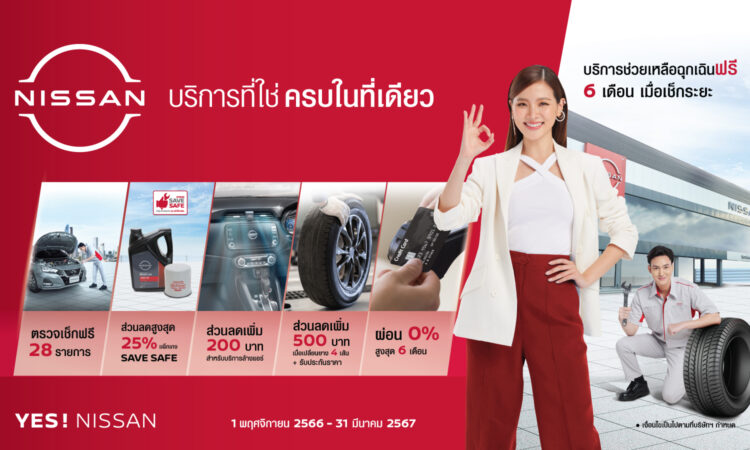 นิสสัน ประเทศไทย ชวนลูกค้านำรถเข้าเช็กระยะ เพื่อเพิ่มความมั่นใจในการขับขี่อย่างปลอดภัย และตอบสนองทุกความต้องการของลูกค้ากับโปรโมชันพิเศษมากมายผ่านแคมเปญ “บริการที่ใช่ ครบในที่เดียว ที่ศูนย์บริการนิสสัน” ด้วยโปรโมชันตรวจเช็กสภาพรถยนต์ฟรี 28 รายการ พร้อมทั้งบริการล้างรถ ดูดฝุ่น ฉีดพ่นน้ำยาฆ่าเชื้อภายในรถยนต์ฟรี และส่วนลดพิเศษอื่น ๆ อีกมากมาย ตั้งแต่วันที่ 1 พฤศจิกายน 2566 – 31 มีนาคม 2567
